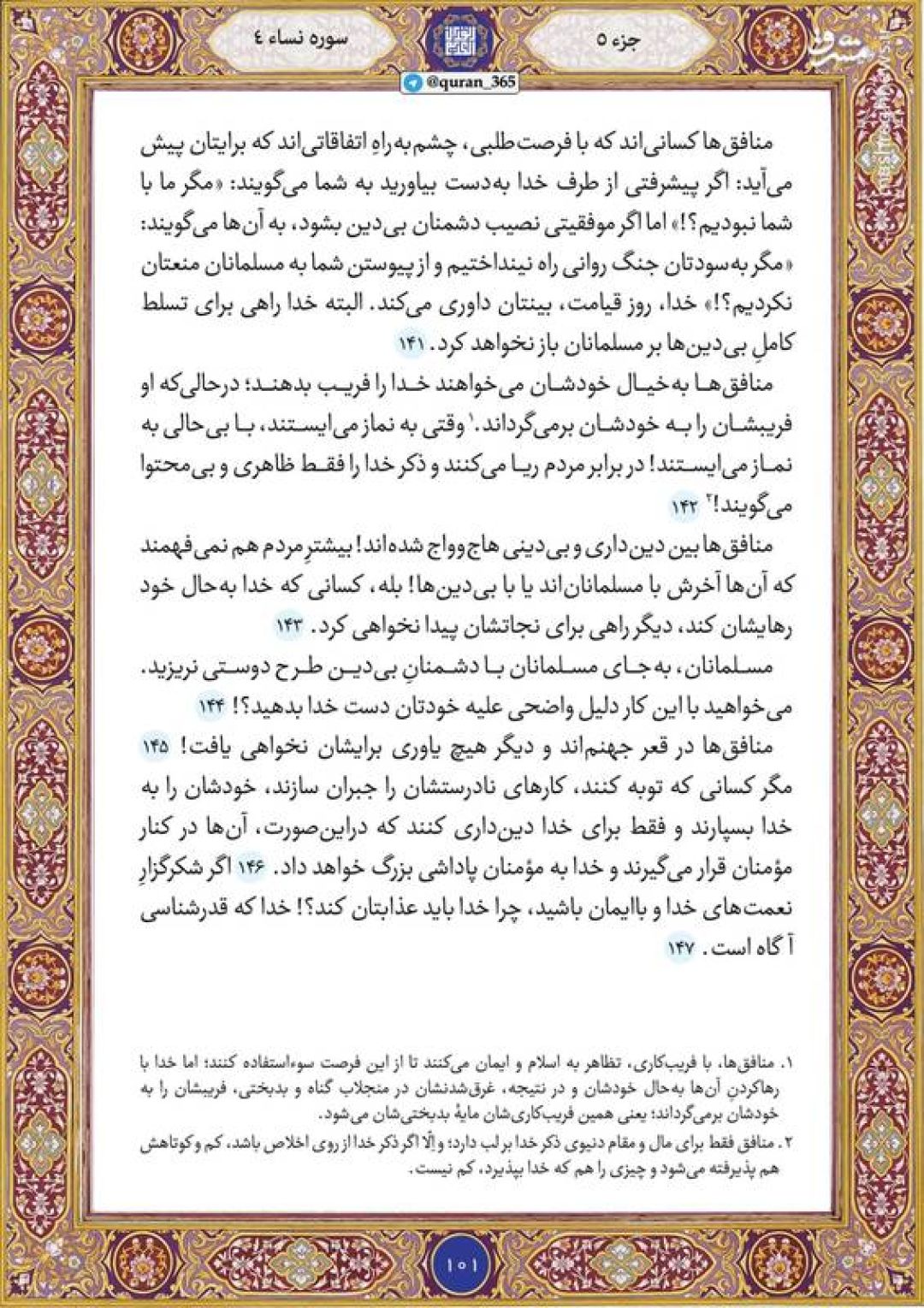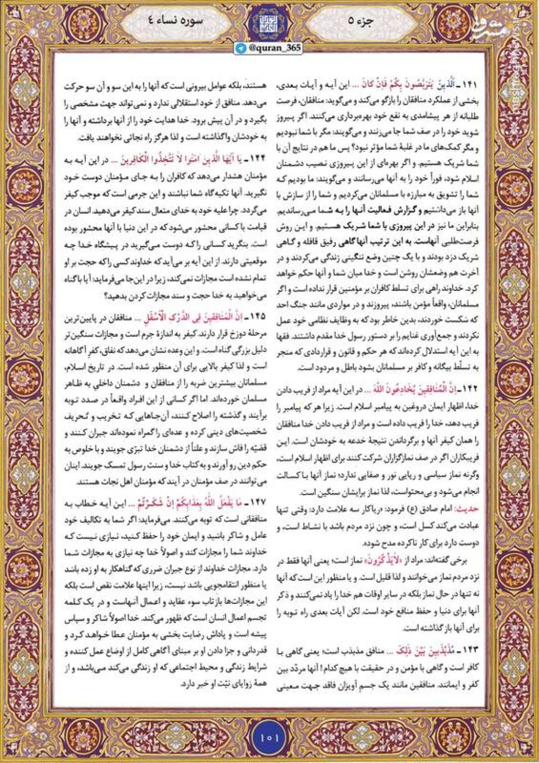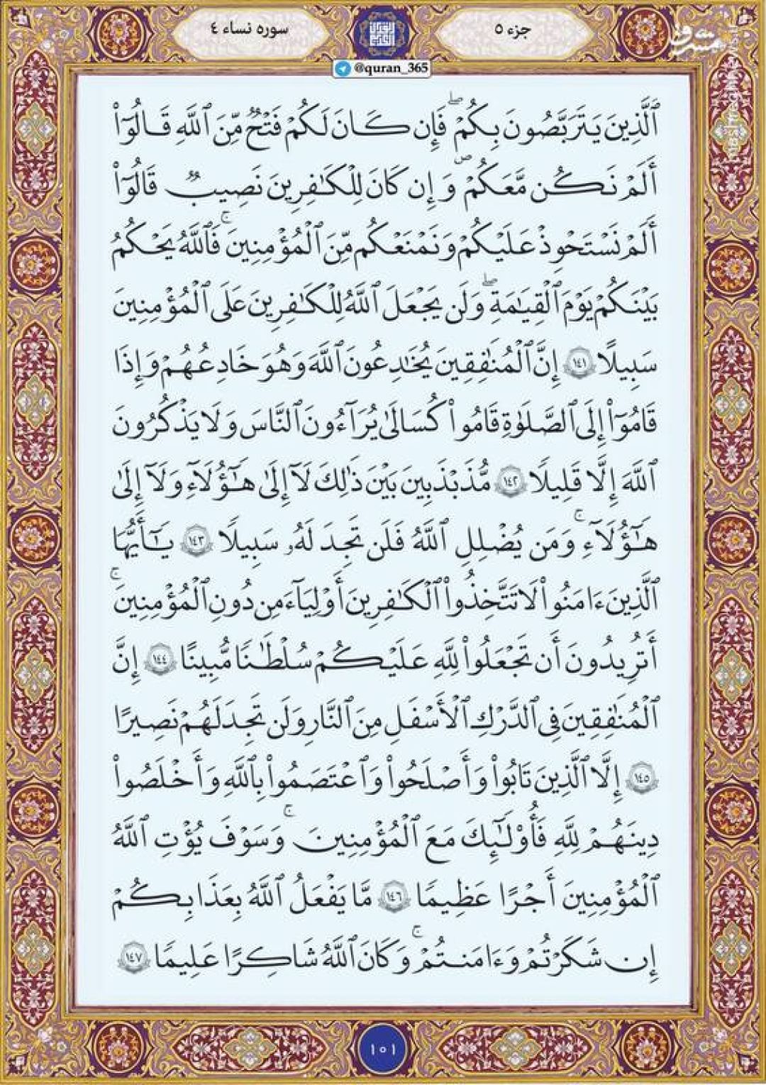 در ادامه جزء پنجم قرآن کریم، صفحه ۱۰۱ شامل آیات ۱۴۱ تا ۱۴۷ سوره مبارکه نساء تقدیم میشود.