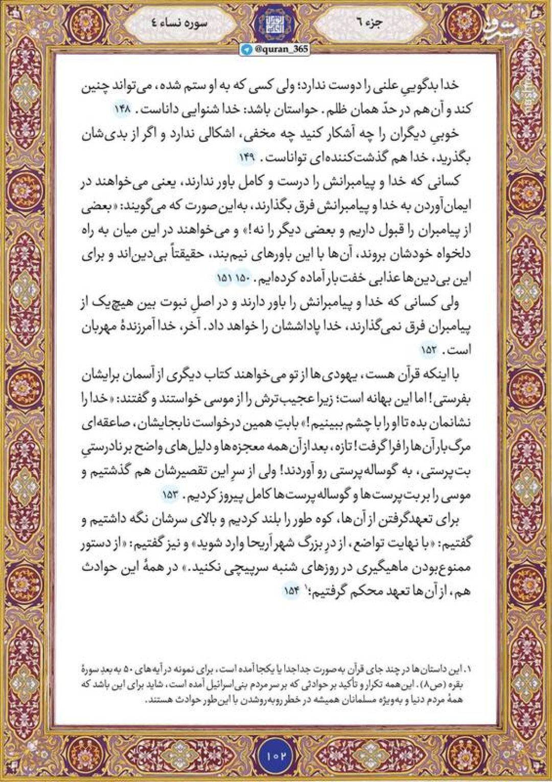 در ادامه جزء ششم قرآن کریم، صفحه ۱۰۲ شامل آیات ۱۴۸ تا ۱۵۴ سوره مبارکه نساء تقدیم میشود.