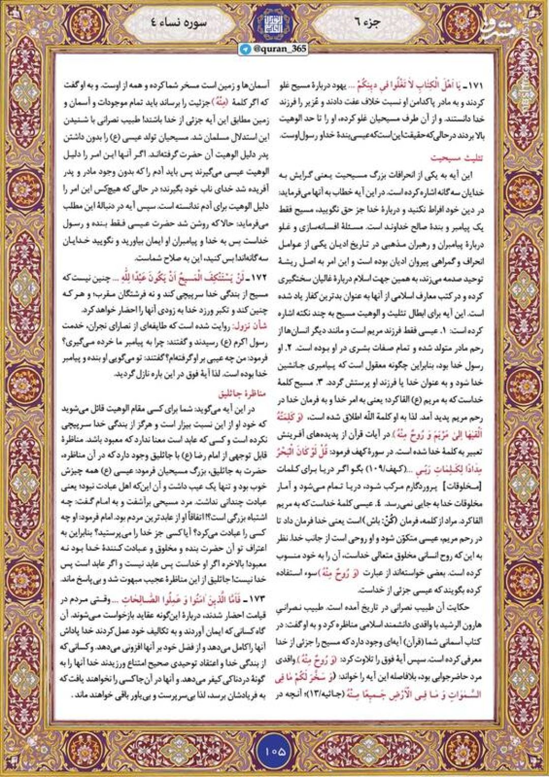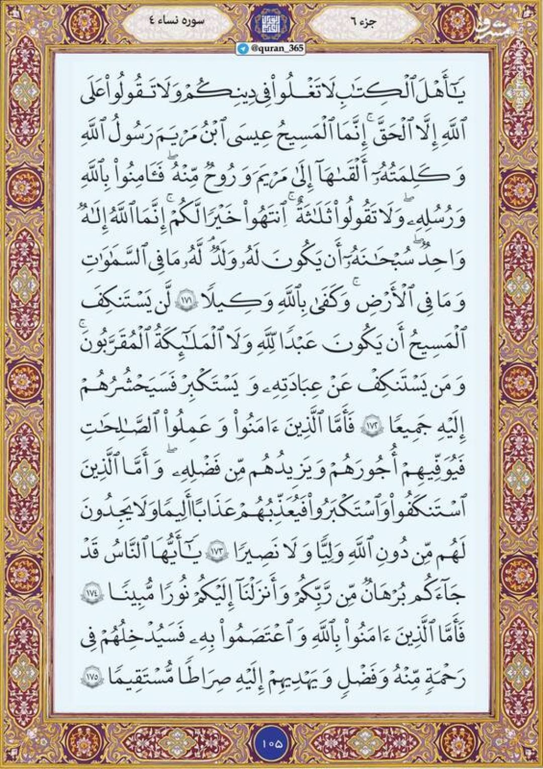 در ادامه جزء ششم قرآن کریم، صفحه ۱۰۵ شامل آیات ۱۷۱ تا ۱۷۵ سوره مبارکه نساء تقدیم میشود.