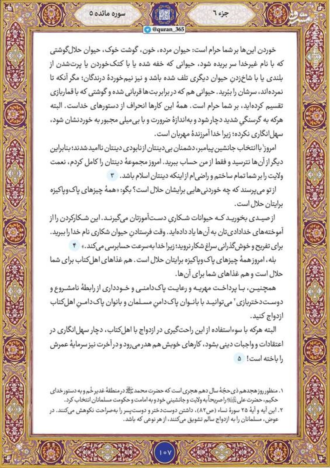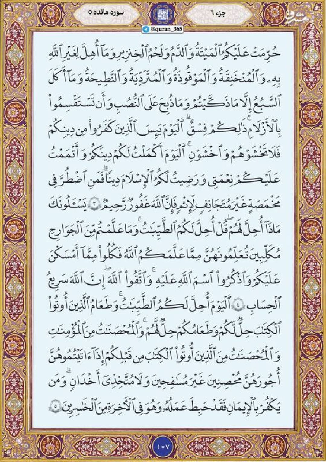 در ادامه جزء ششم قرآن کریم، صفحه ۱۰۷ شامل آیات ۳ تا ۵ سوره مبارکه مائده تقدیم میشود.