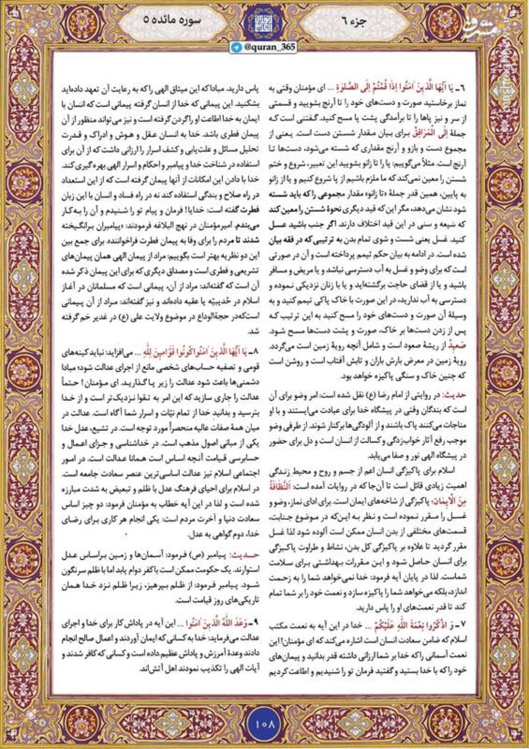در ادامه جزء ششم قرآن کریم، صفحه ۱۰۸ شامل آیات ۶ تا ۹ سوره مبارکه مائده تقدیم میشود.