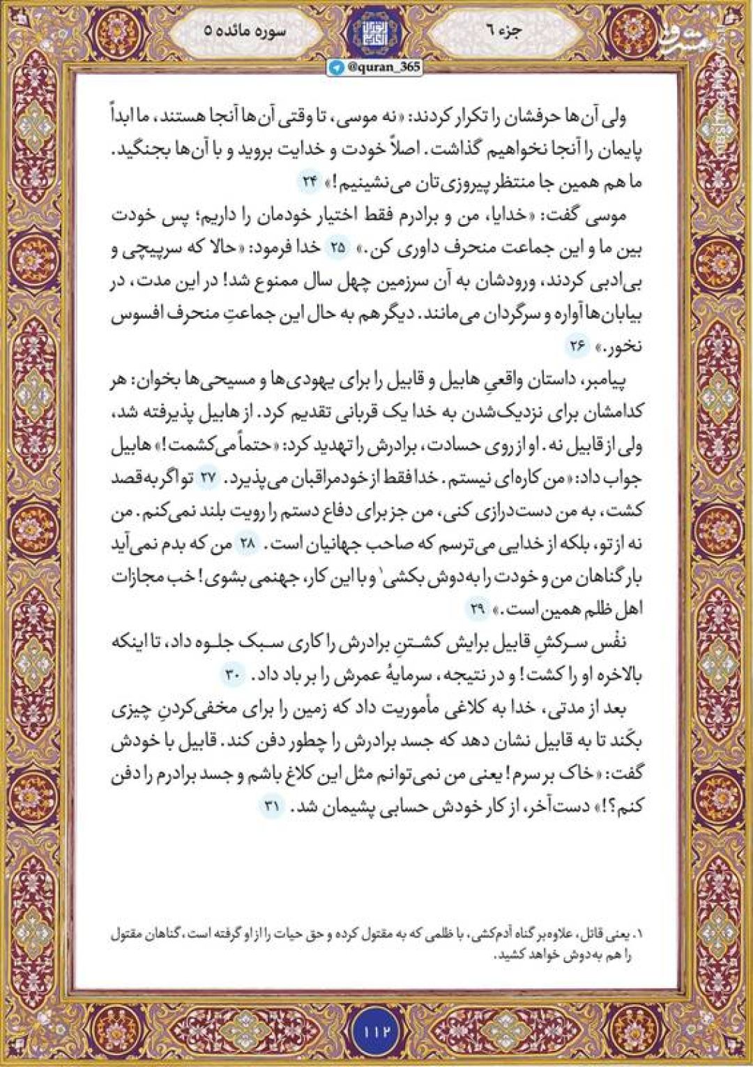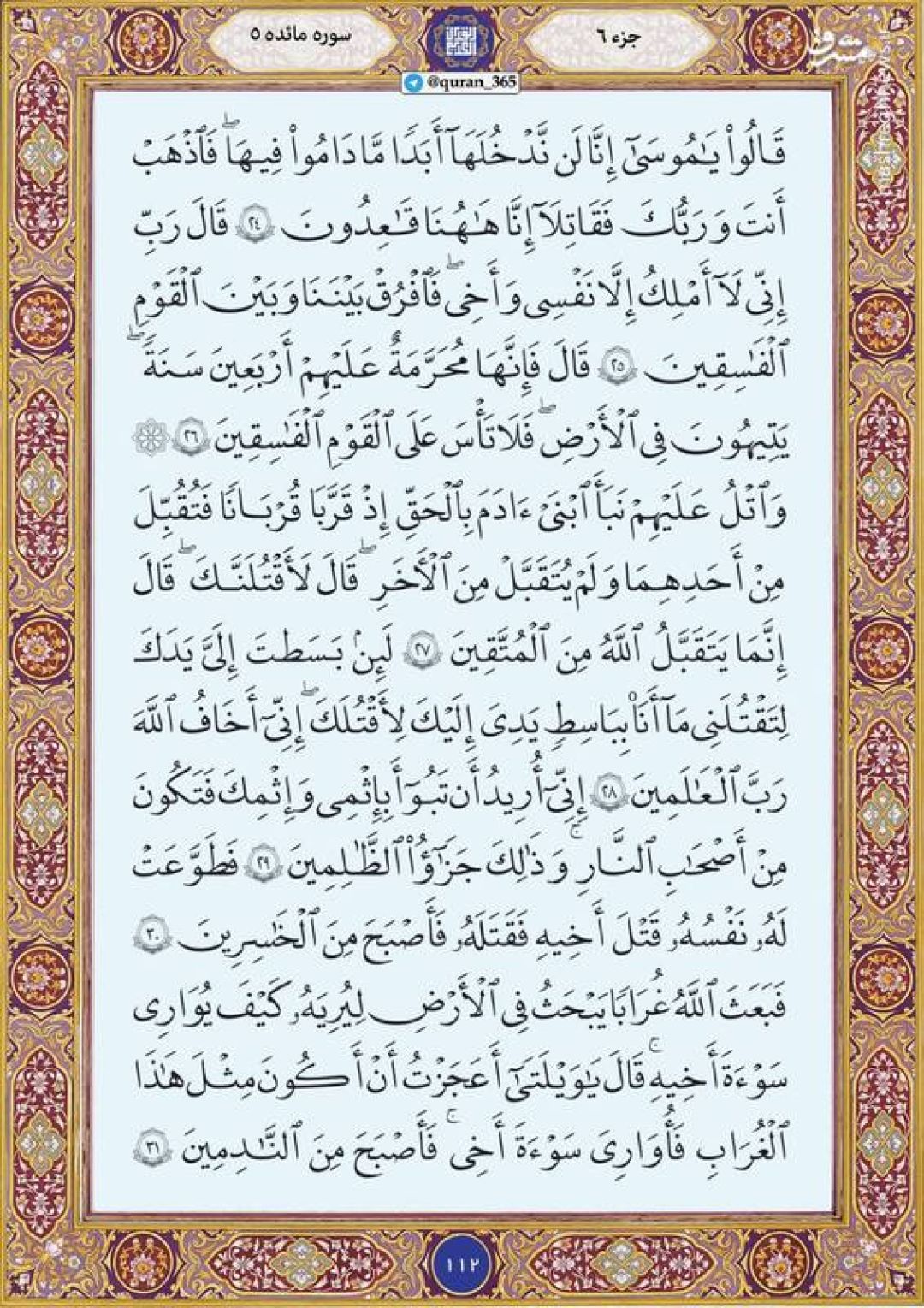 در ادامه جزء ششم قرآن کریم، صفحه ۱۱۲ شامل آیات ۲۴ تا ۳۱ سوره مبارکه مائده تقدیم میشود.