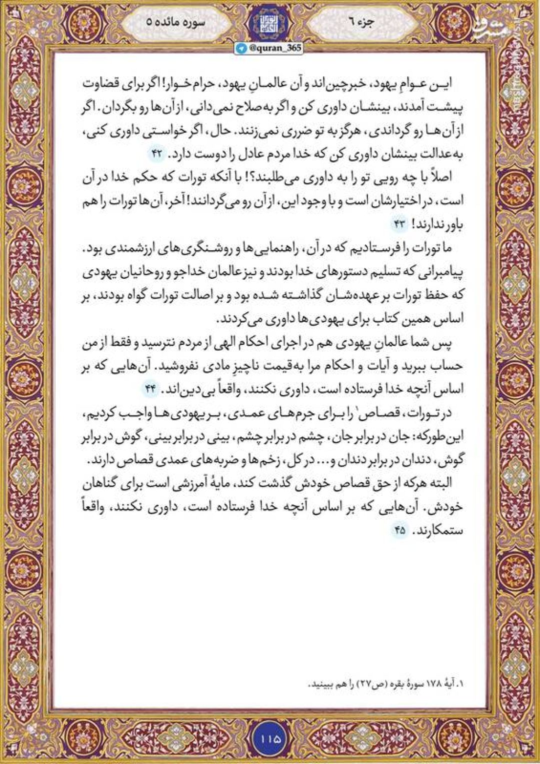 در ادامه جزء ششم قرآن کریم، صفحه ۱۱۵ شامل آیات ۴۲ تا ۴۵ سوره مبارکه مائده تقدیم میشود.
