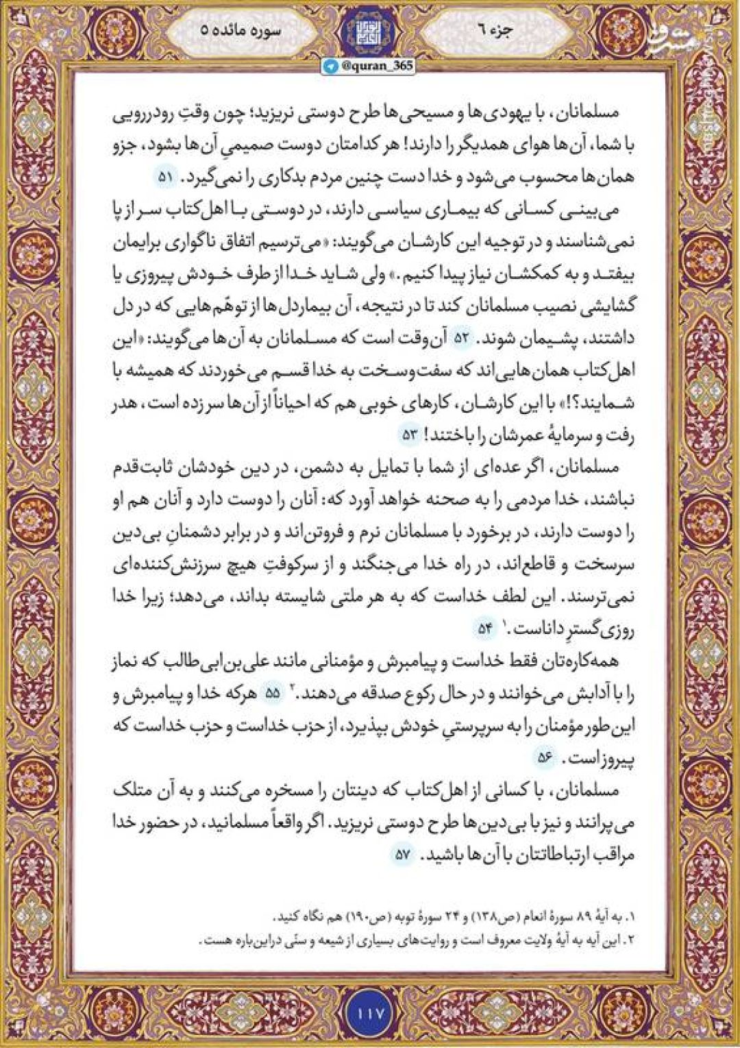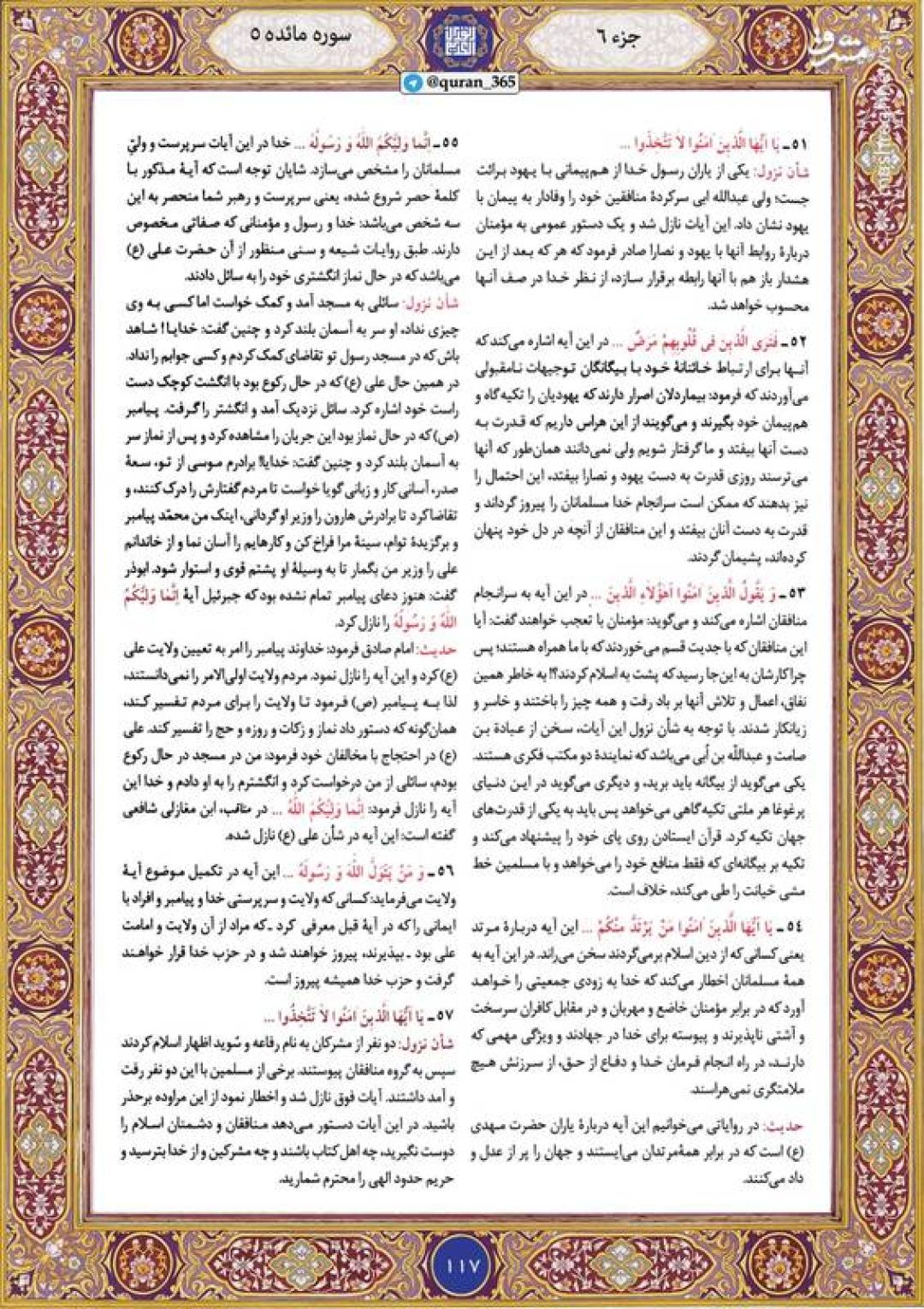 در ادامه جزء ششم قرآن کریم، صفحه ۱۱۷ شامل آیات ۵۲ تا ۵۷ سوره مبارکه مائده تقدیم میشود.