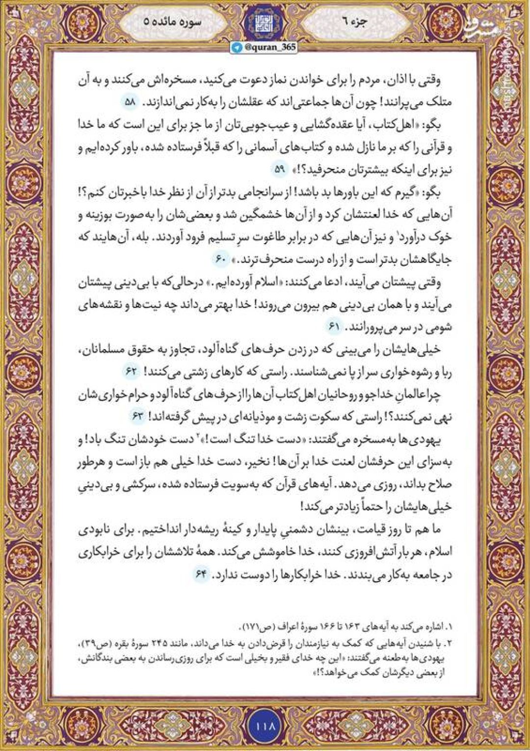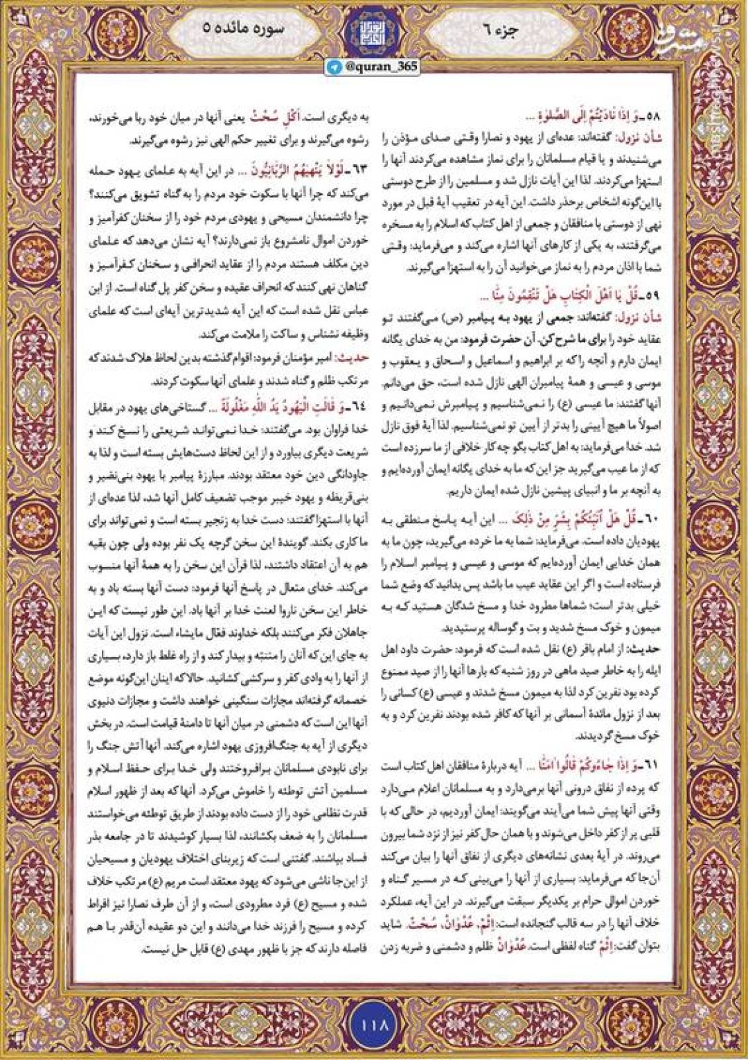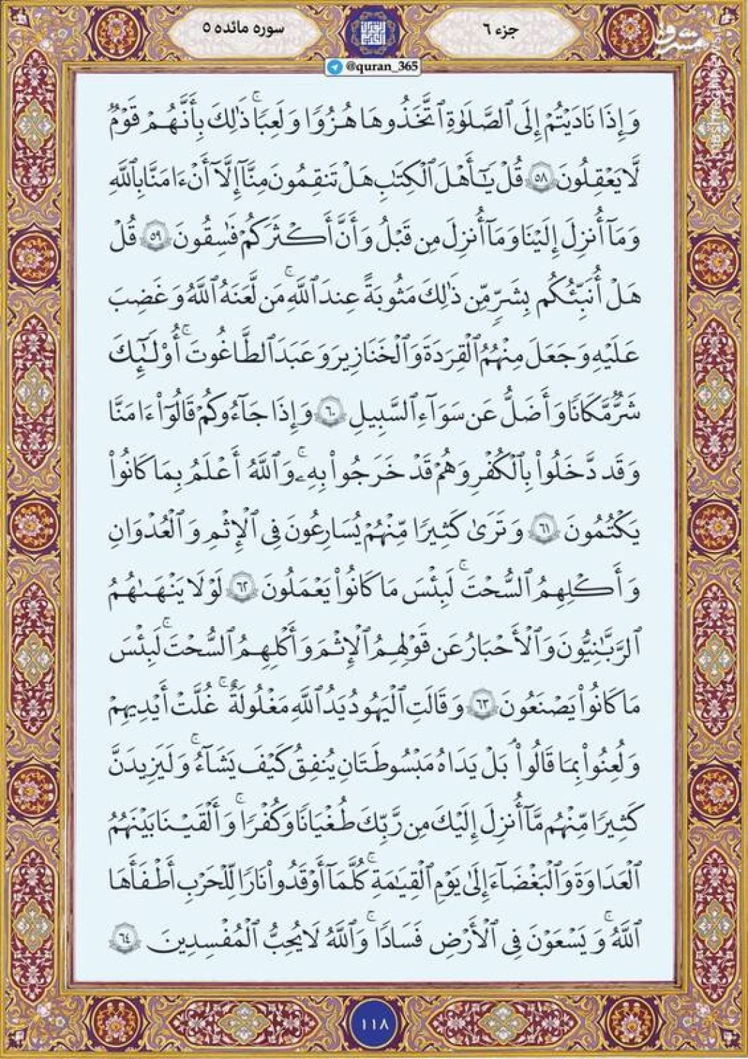 در ادامه جزء ششم قرآن کریم، صفحه ۱۱۸ شامل آیات ۵۸ تا ۶۴ سوره مبارکه مائده تقدیم میشود.