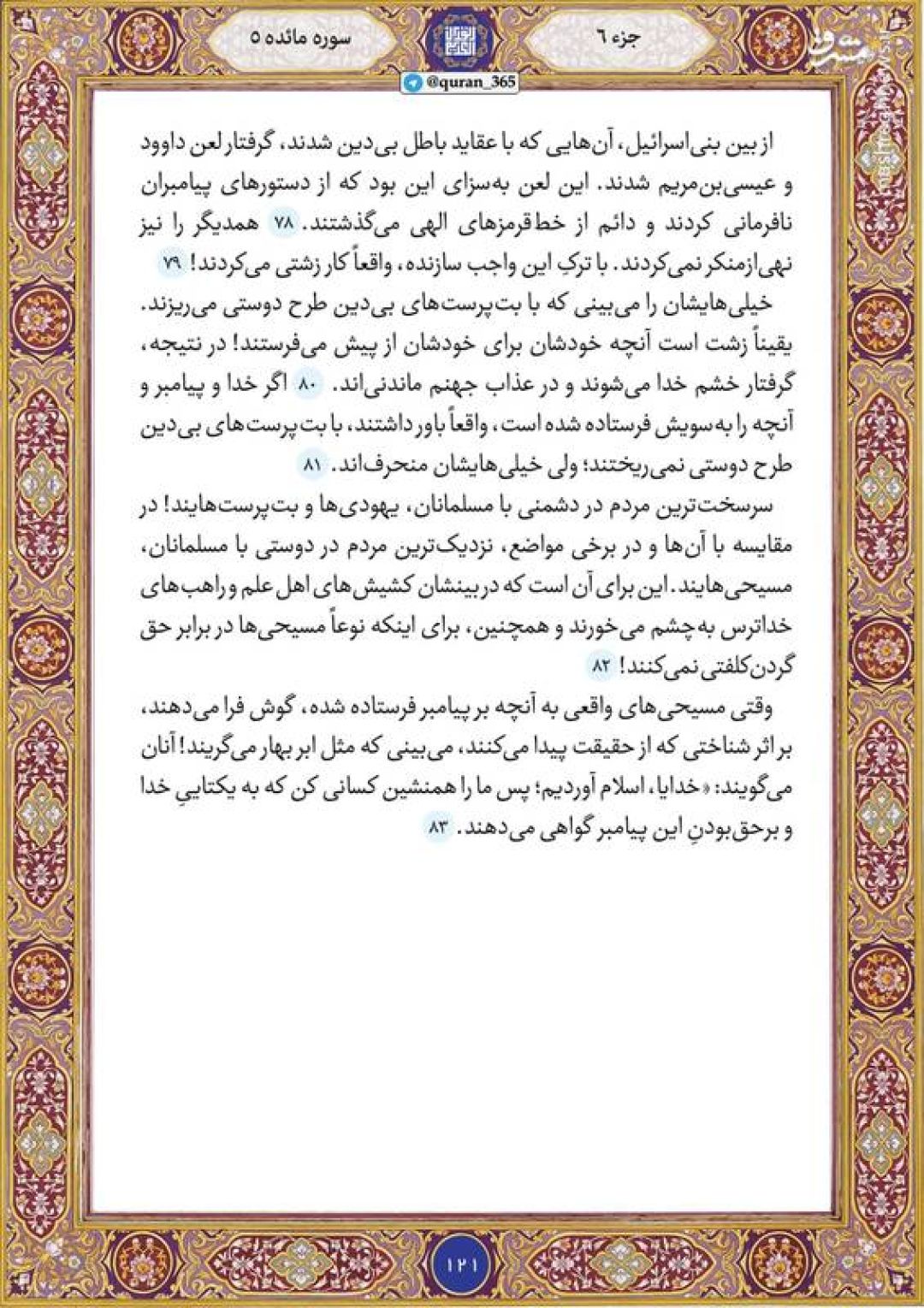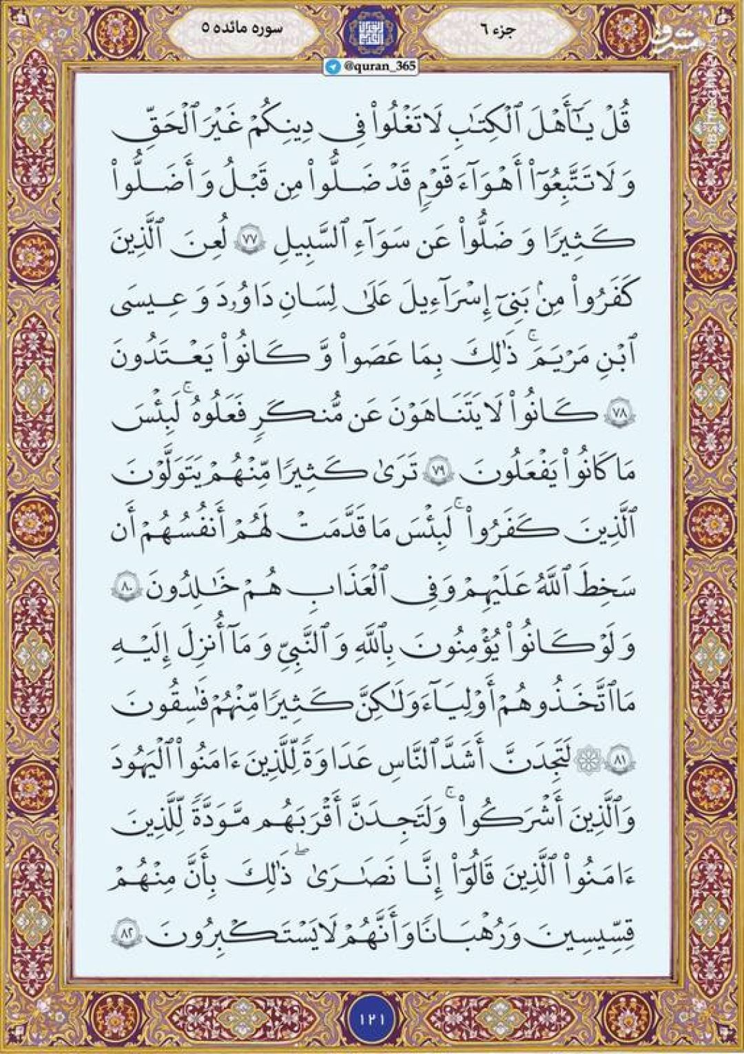 در ادامه جزء ششم قرآن کریم، صفحه ۱۲۱ شامل آیات ۷۸ تا ۸۳ سوره مبارکه مائده تقدیم میشود.