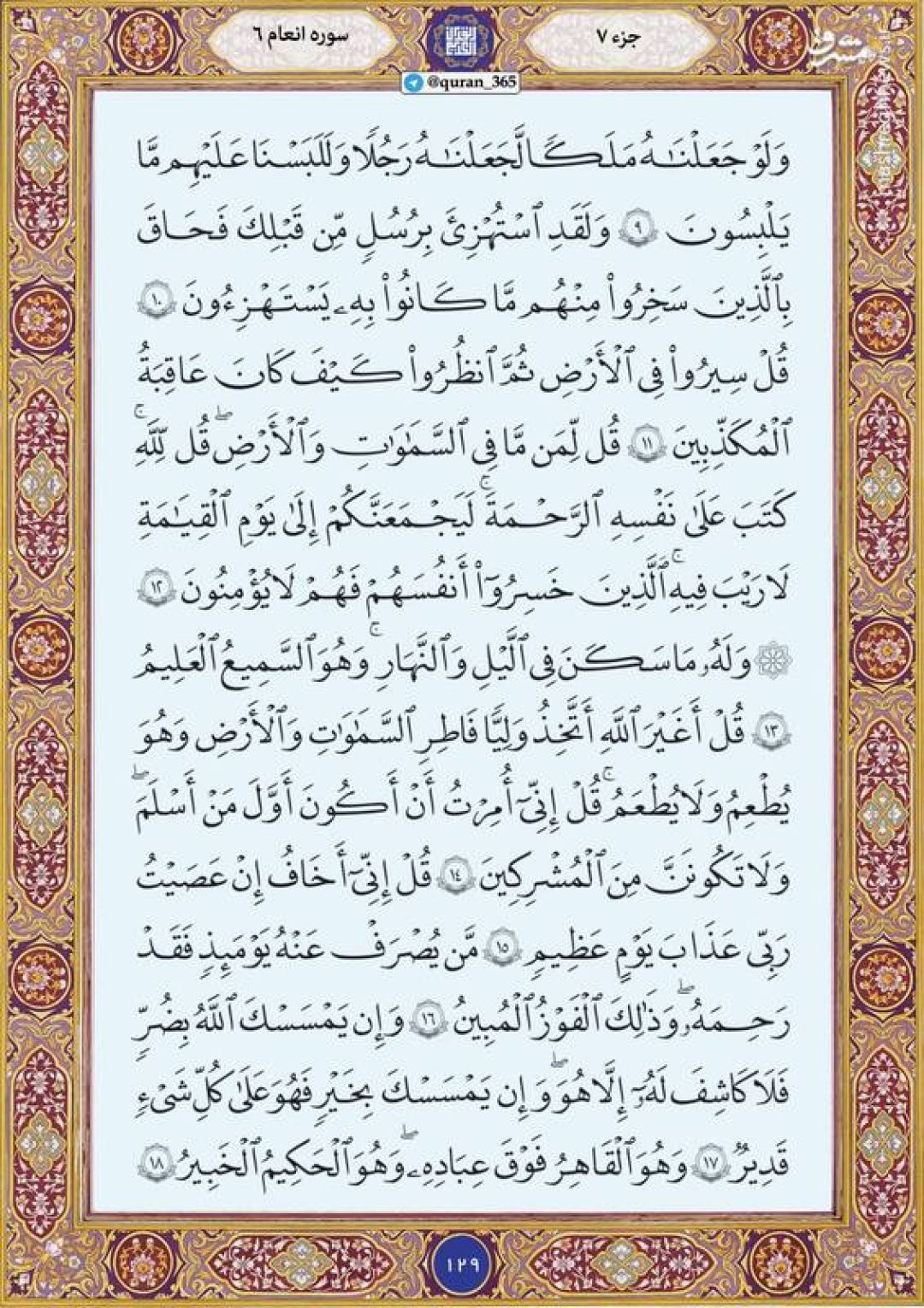 در ادامه جزء هفتم قرآن کریم، صفحه ۱۲۹ شامل آیات ۹ تا ۱۸ سوره مبارکه انعام تقدیم میشود.