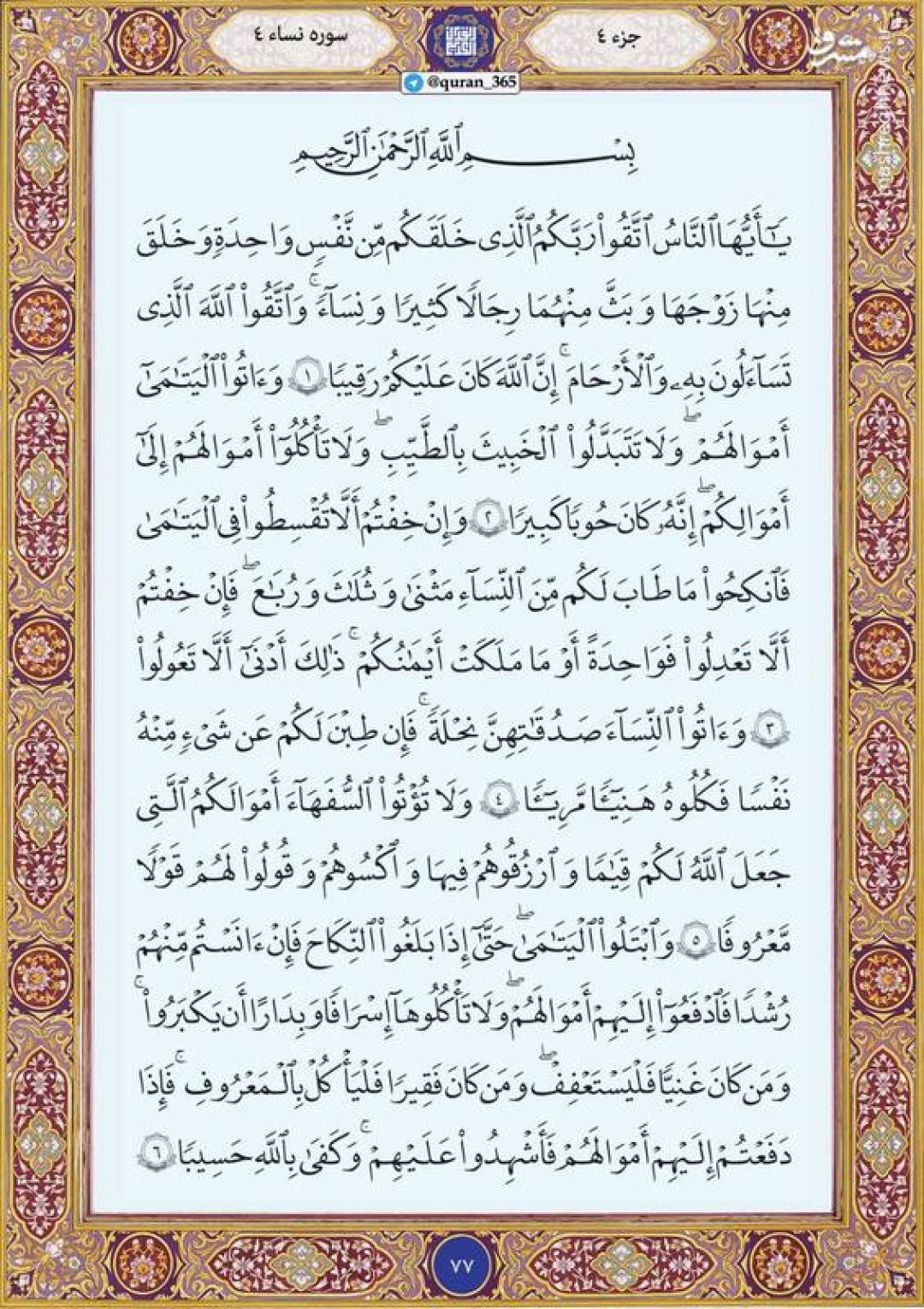در ادامه جزء چهارم قرآن کریم، صفحه ۷۷ شامل آیات ۱ تا ۶ سوره مبارکه نساء تقدیم میشود.