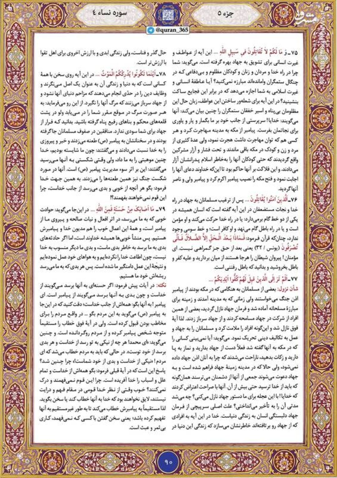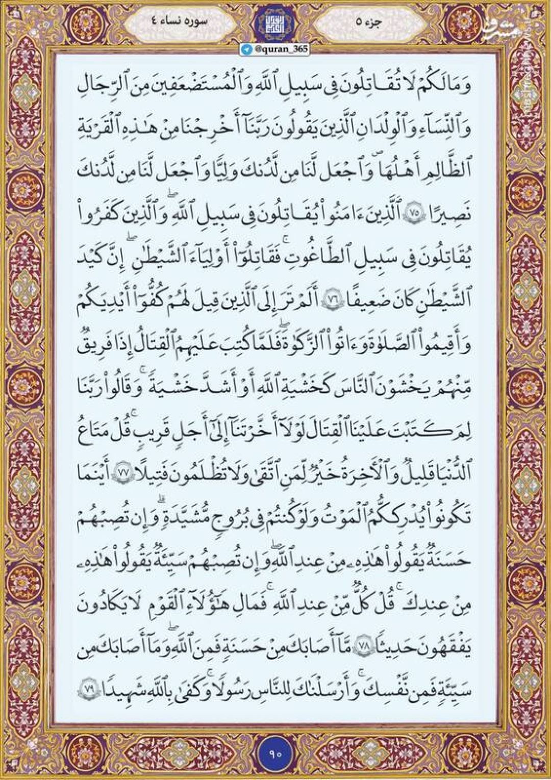 در ادامه جزء پنجم قرآن کریم، صفحه ۹۰ شامل آیات ۷۵ تا ۷۹ سوره مبارکه نساء تقدیم میشود.