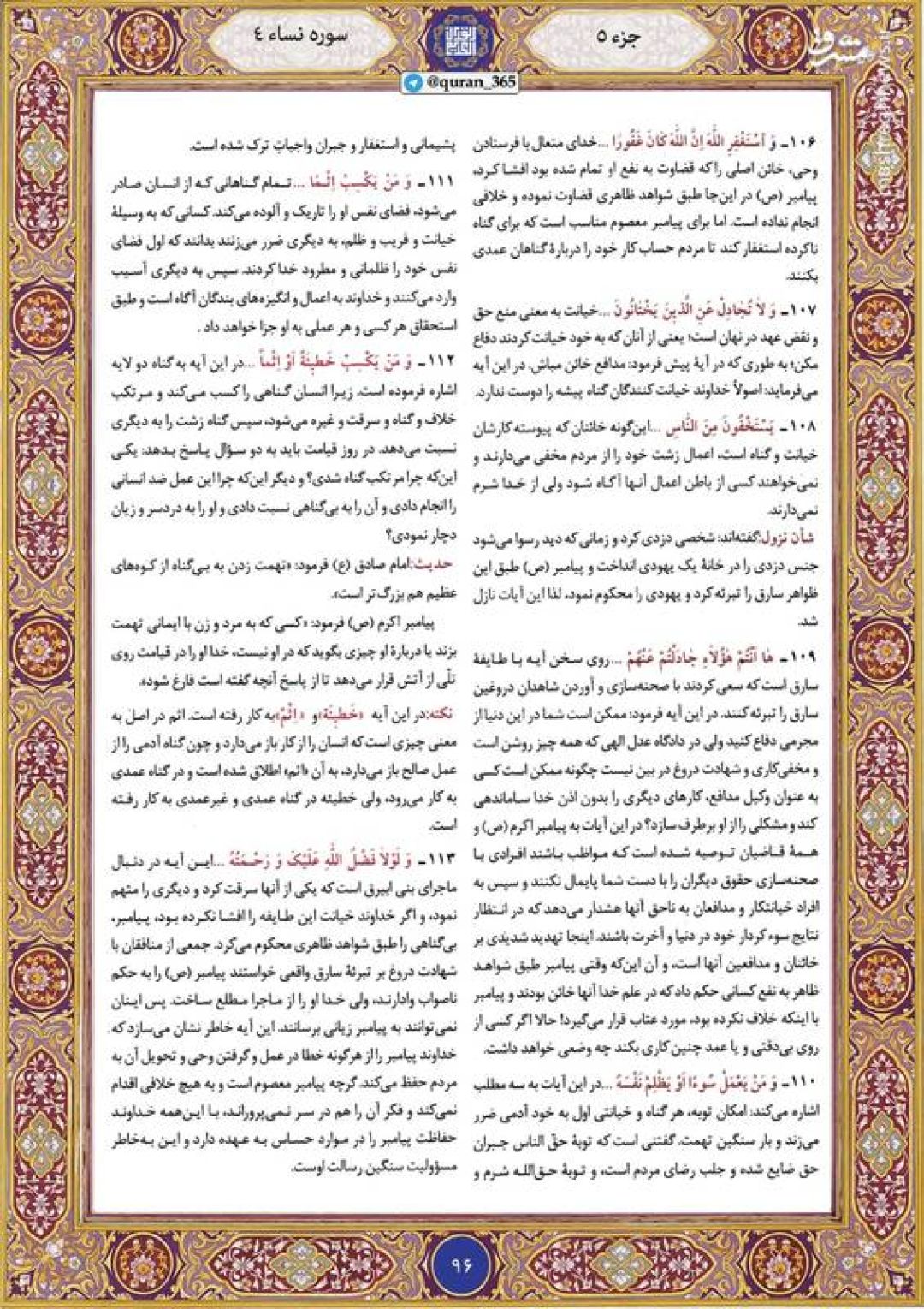 در ادامه جزء پنجم قرآن کریم، صفحه ۹۶ شامل آیات ۱۰۶ تا ۱۱۳ سوره مبارکه نساء تقدیم میشود.