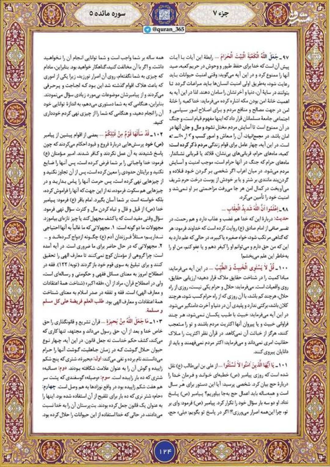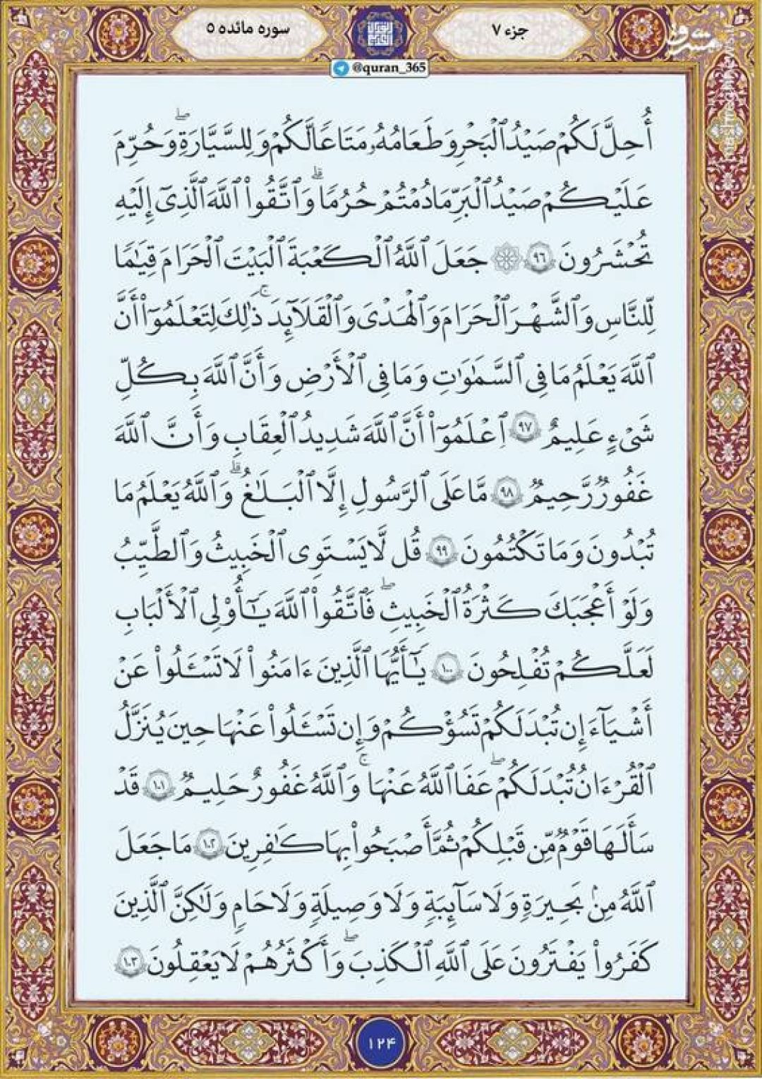 در ادامه جزء هفتم قرآن کریم، صفحه 124 شامل آیات 96 تا 103 سوره مبارکه مائده تقدیم میشود.