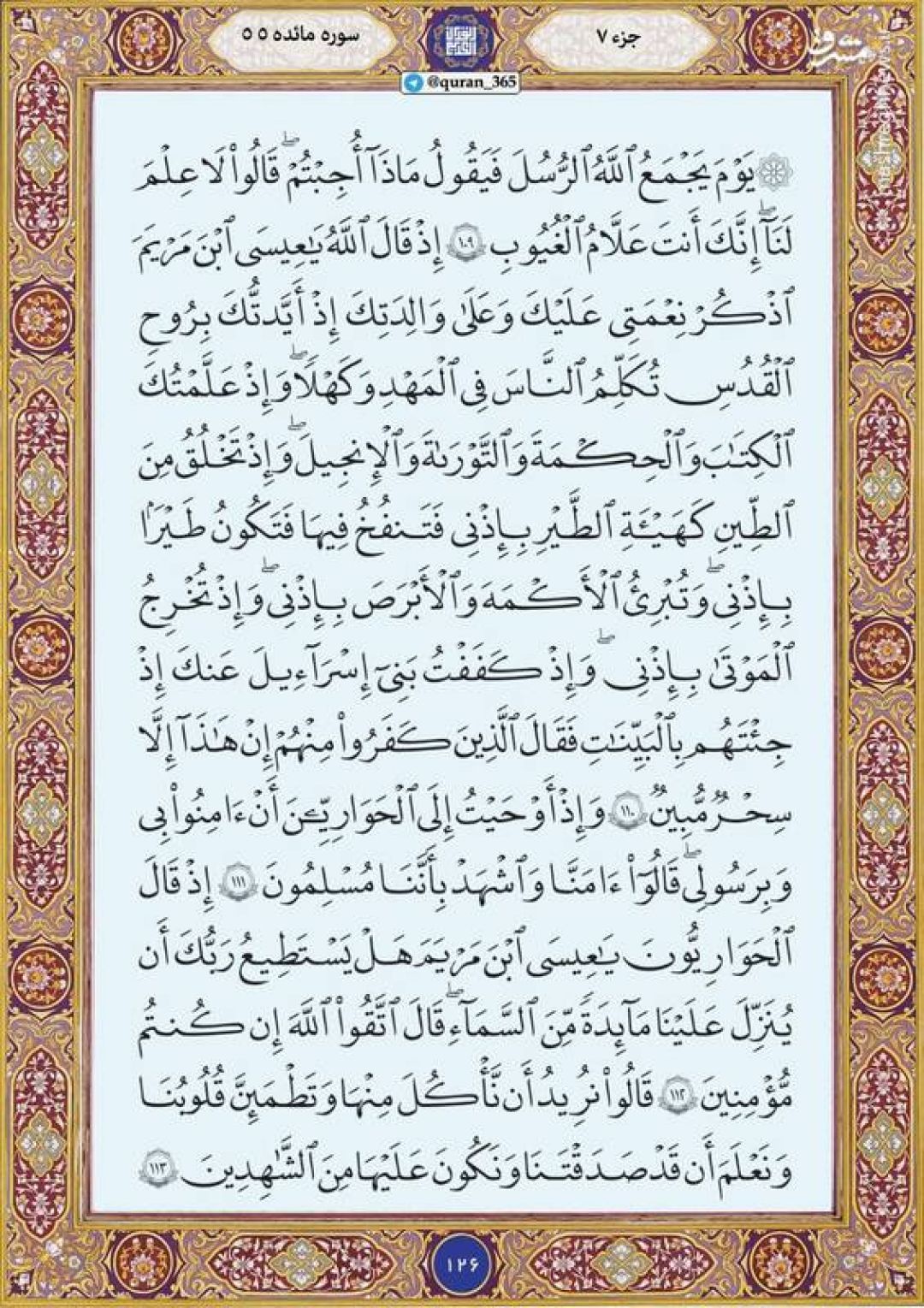 در ادامه جزء هفتم قرآن کریم، صفحه 126 شامل آیات 109 تا 113 سوره مبارکه مائده تقدیم میشود.