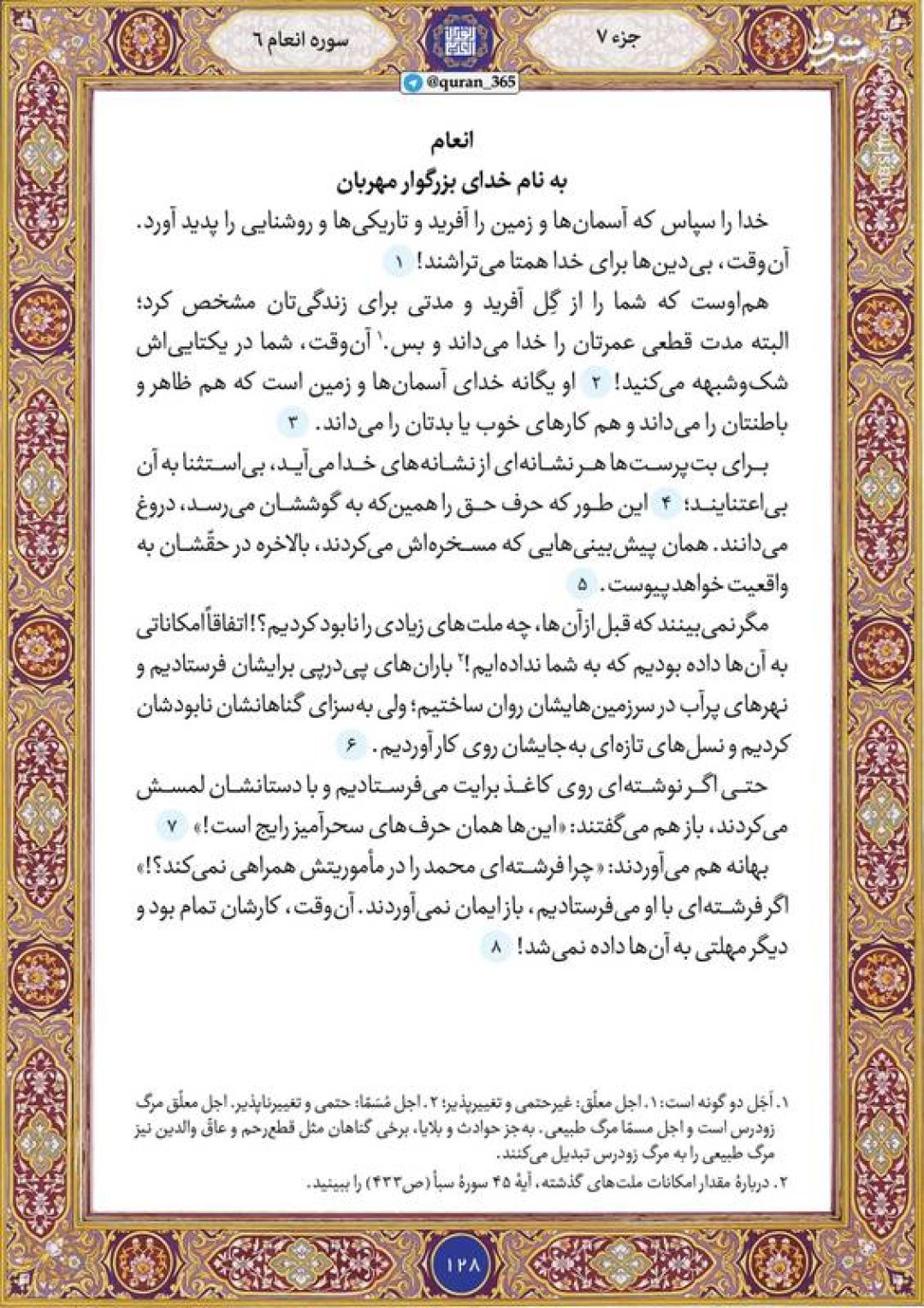 در ادامه جزء هفتم قرآن کریم، صفحه 128 شامل آیات 1 تا 8 سوره مبارکه انعام تقدیم میشود.