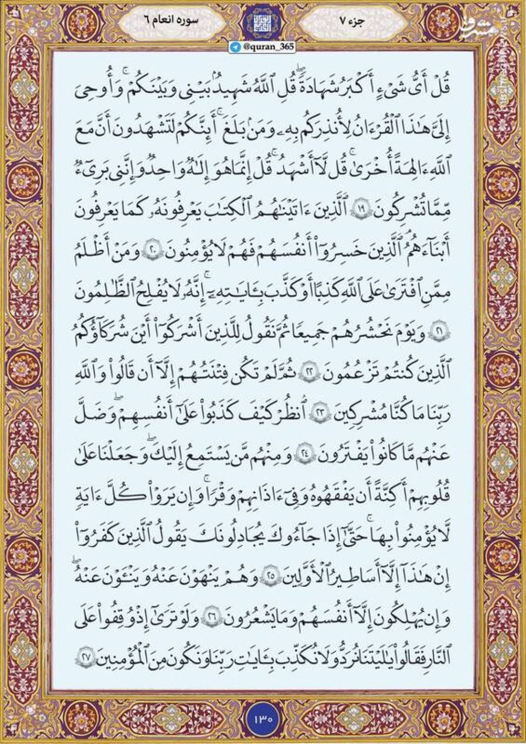 در ادامه جزء هفتم قرآن کریم، صفحه 130 شامل آیات 19 تا ۱۸ سوره مبارکه انعام تقدیم میشود.
