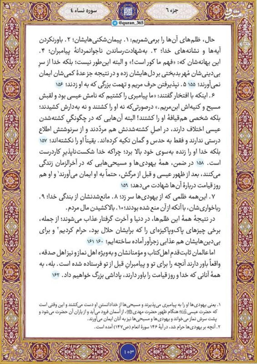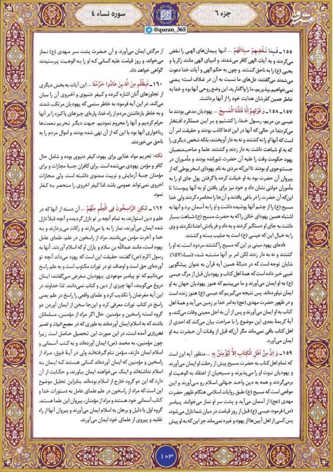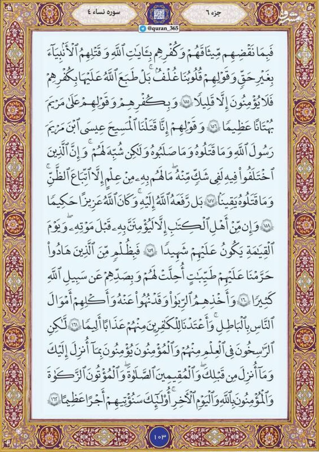 در ادامه جزء ششم قرآن کریم، صفحه ۱۰۳ شامل آیات ۱۵۵ تا ۱۶۲ سوره مبارکه نساء تقدیم میشود.
