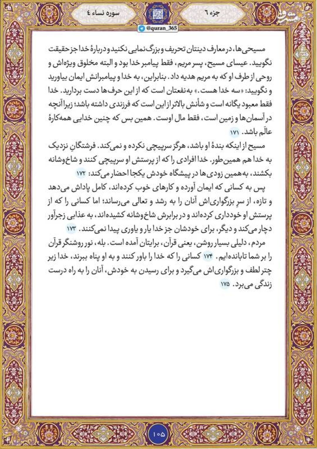 در ادامه جزء ششم قرآن کریم، صفحه ۱۰۵ شامل آیات ۱۷۱ تا ۱۷۵ سوره مبارکه نساء تقدیم میشود.