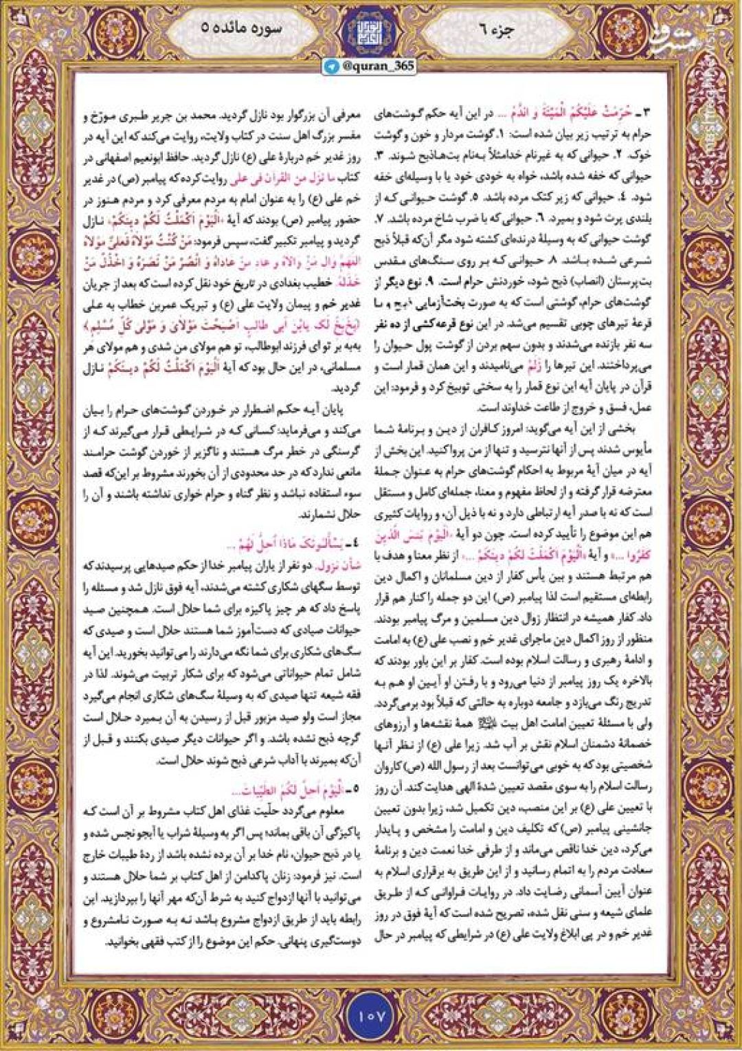 در ادامه جزء ششم قرآن کریم، صفحه ۱۰۷ شامل آیات ۳ تا ۵ سوره مبارکه مائده تقدیم میشود.