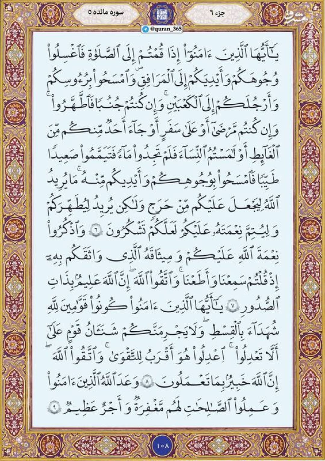 در ادامه جزء ششم قرآن کریم، صفحه ۱۰۸ شامل آیات ۶ تا ۹ سوره مبارکه مائده تقدیم میشود.