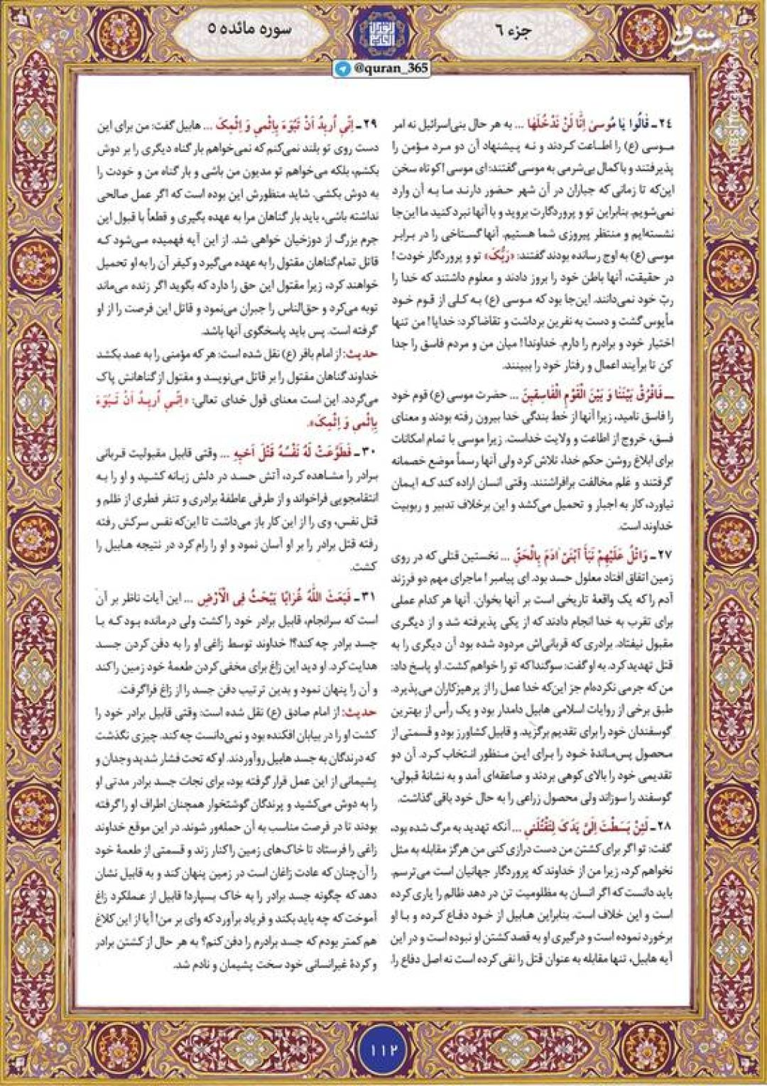 در ادامه جزء ششم قرآن کریم، صفحه ۱۱۲ شامل آیات ۲۴ تا ۳۱ سوره مبارکه مائده تقدیم میشود.