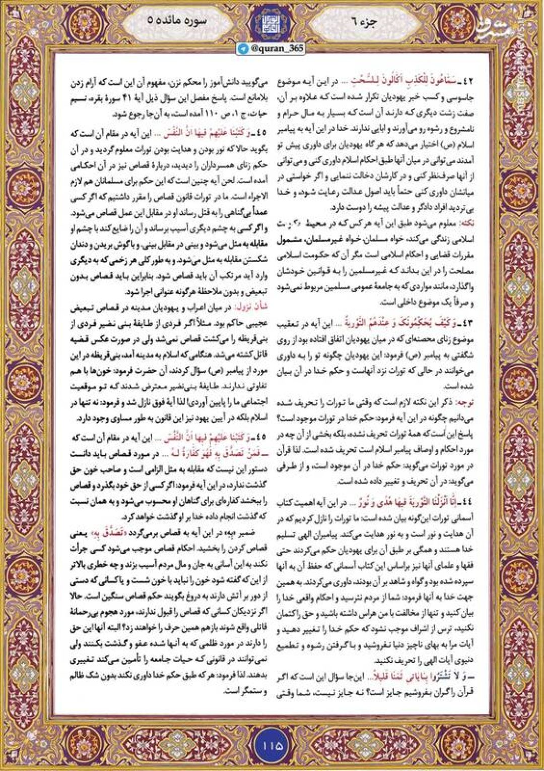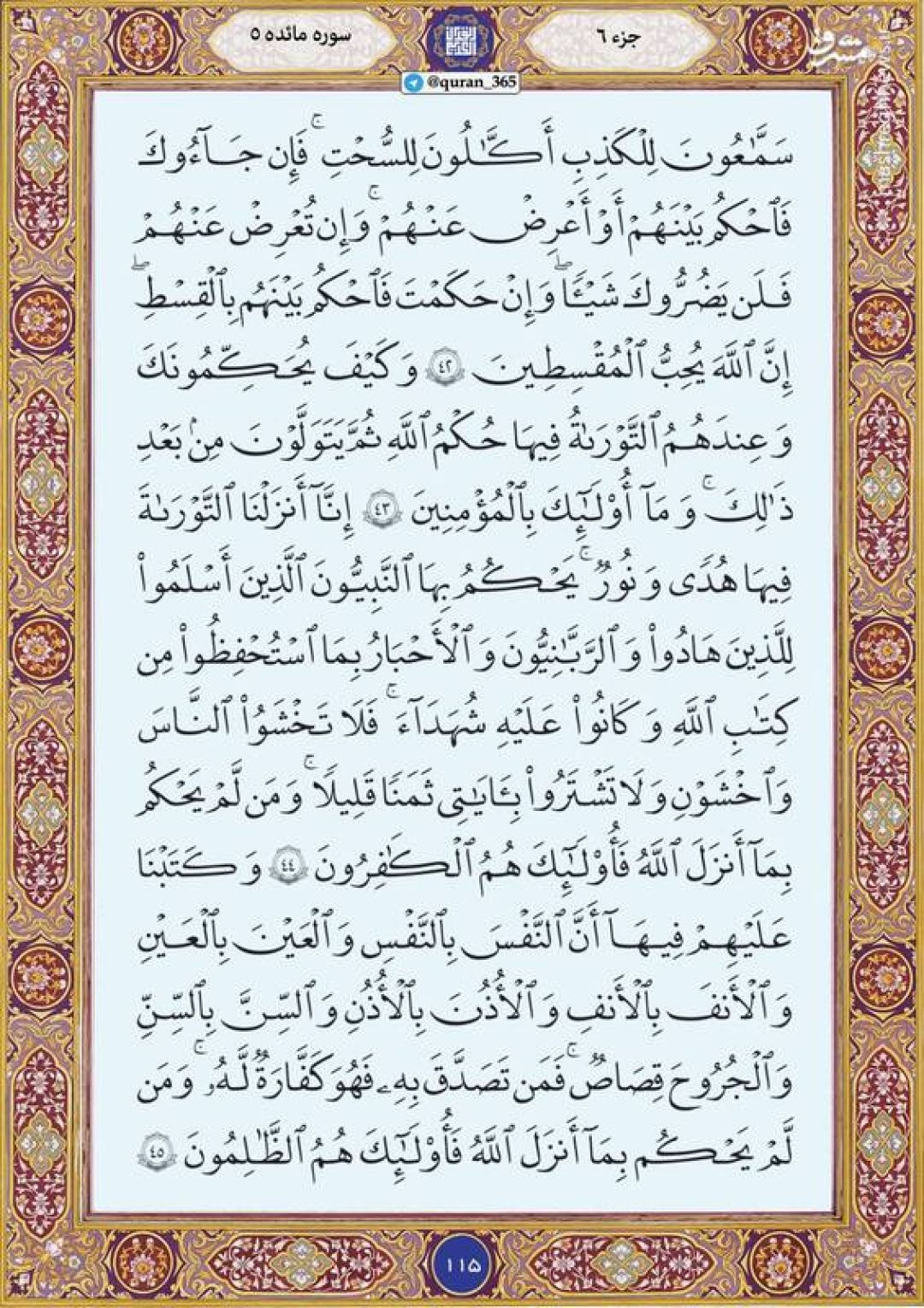 در ادامه جزء ششم قرآن کریم، صفحه ۱۱۵ شامل آیات ۴۲ تا ۴۵ سوره مبارکه مائده تقدیم میشود.