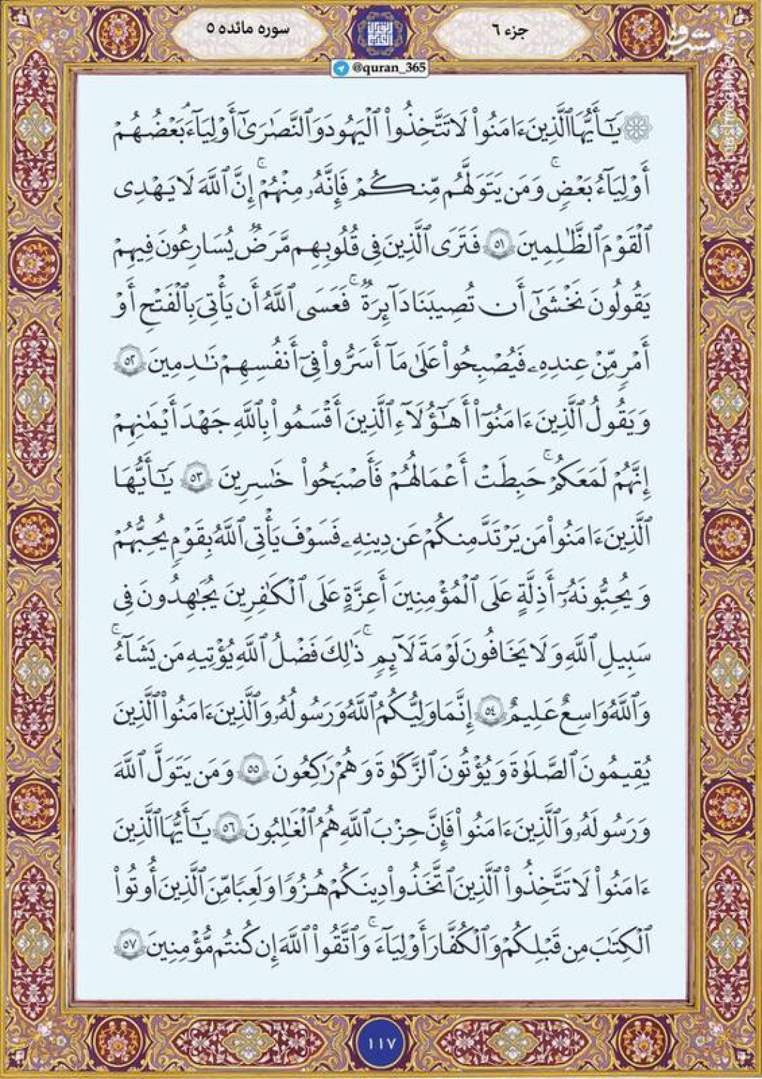 در ادامه جزء ششم قرآن کریم، صفحه ۱۱۷ شامل آیات ۵۲ تا ۵۷ سوره مبارکه مائده تقدیم میشود.