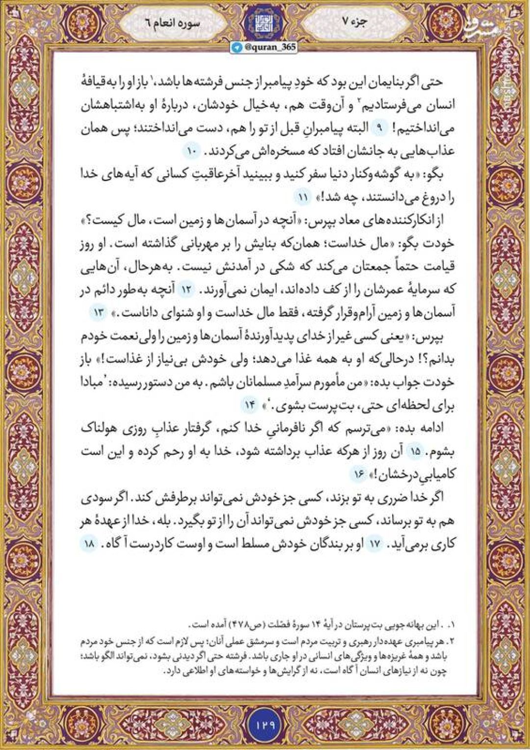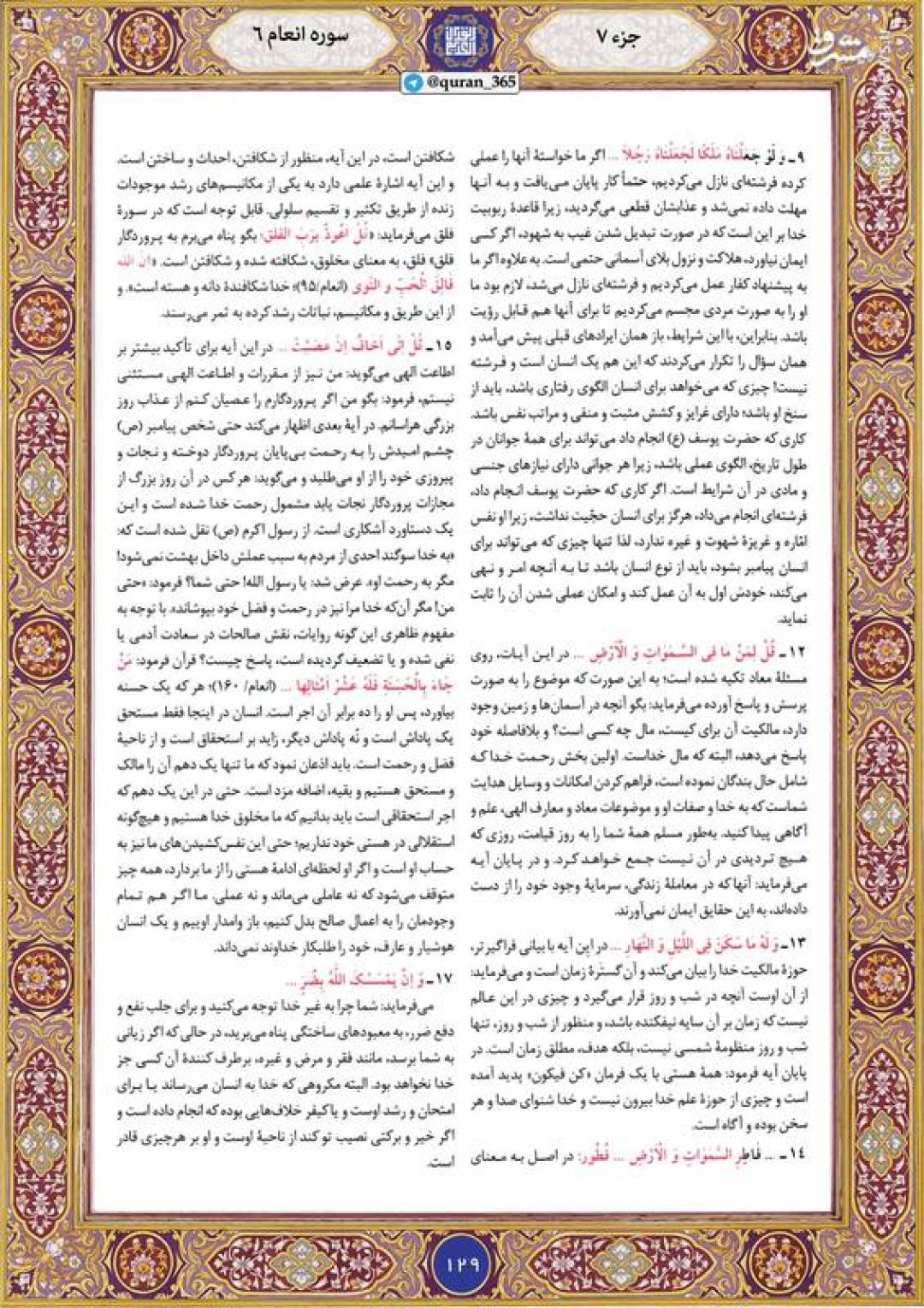 در ادامه جزء هفتم قرآن کریم، صفحه ۱۲۹ شامل آیات ۹ تا ۱۸ سوره مبارکه انعام تقدیم میشود.