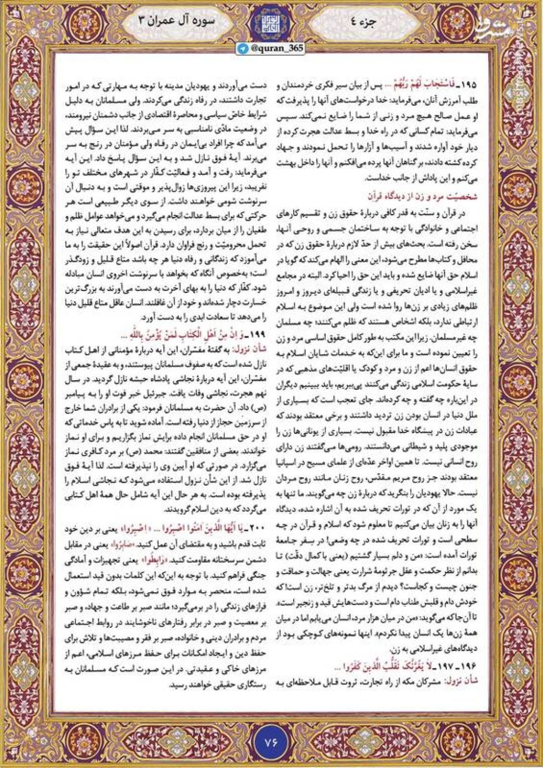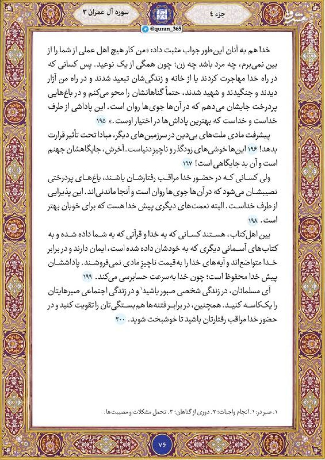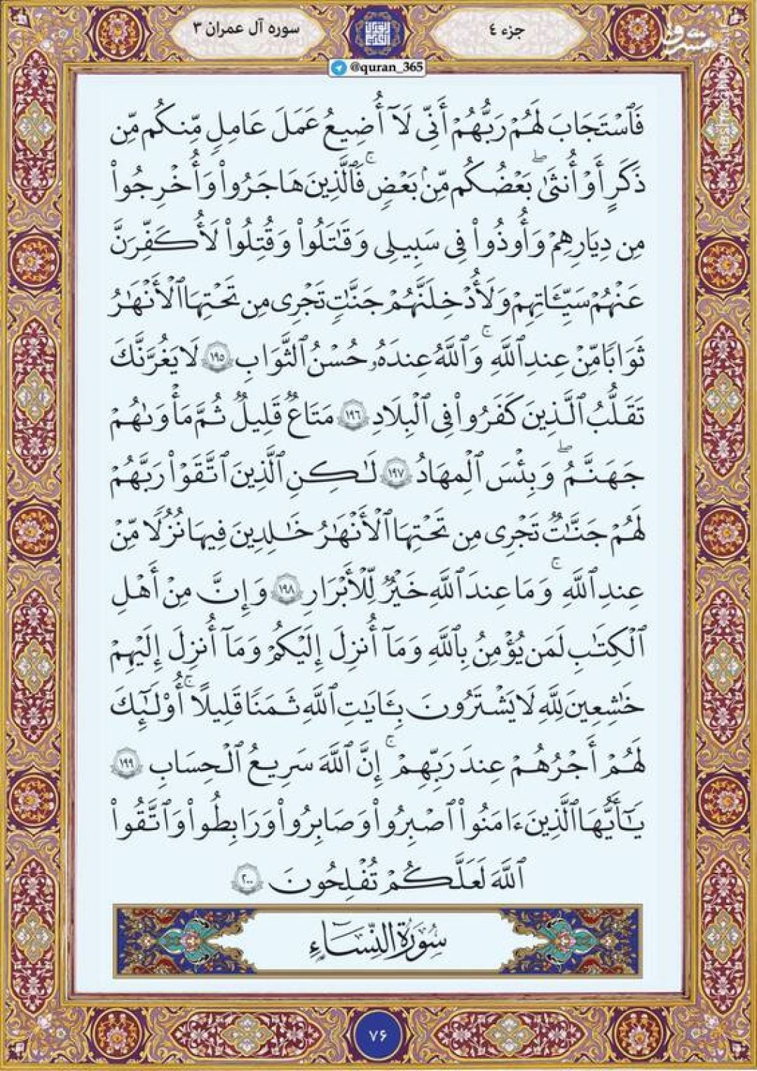 در ادامه جزء چهارم قرآن کریم، صفحه ۷۶ شامل آیات ۱۹۵ تا ۲۰۰ سوره مبارکه آل عمران تقدیم میشود.