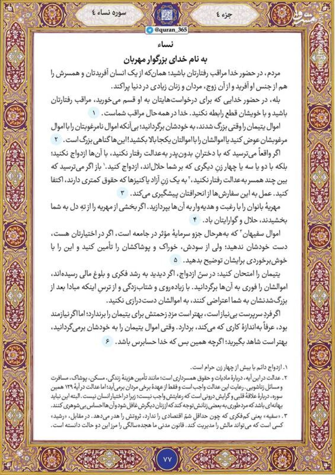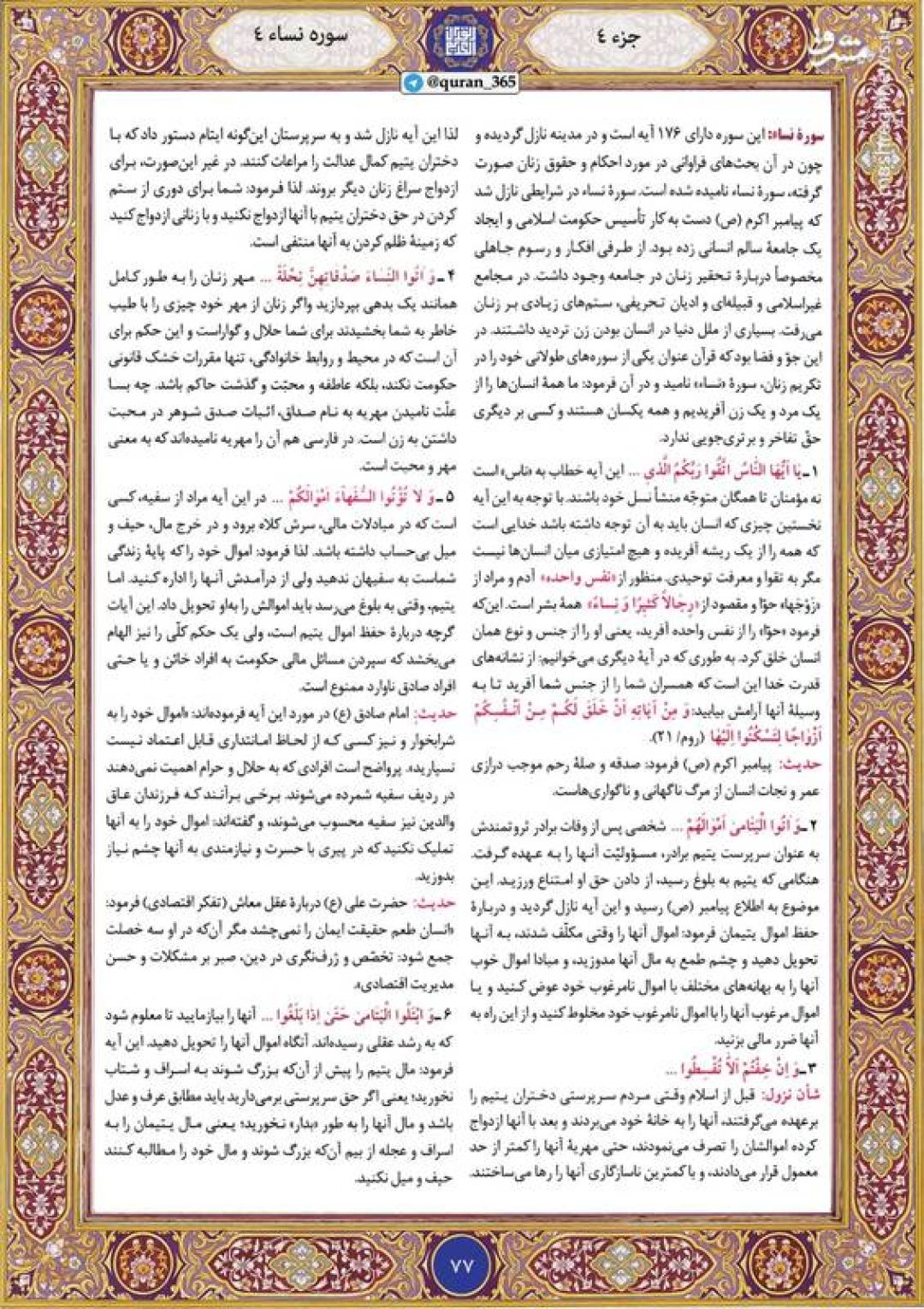 در ادامه جزء چهارم قرآن کریم، صفحه ۷۷ شامل آیات ۱ تا ۶ سوره مبارکه نساء تقدیم میشود.