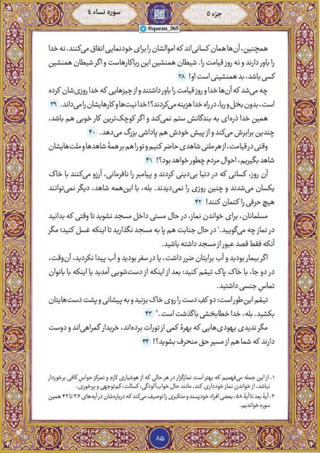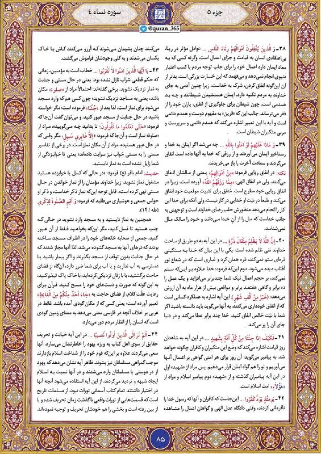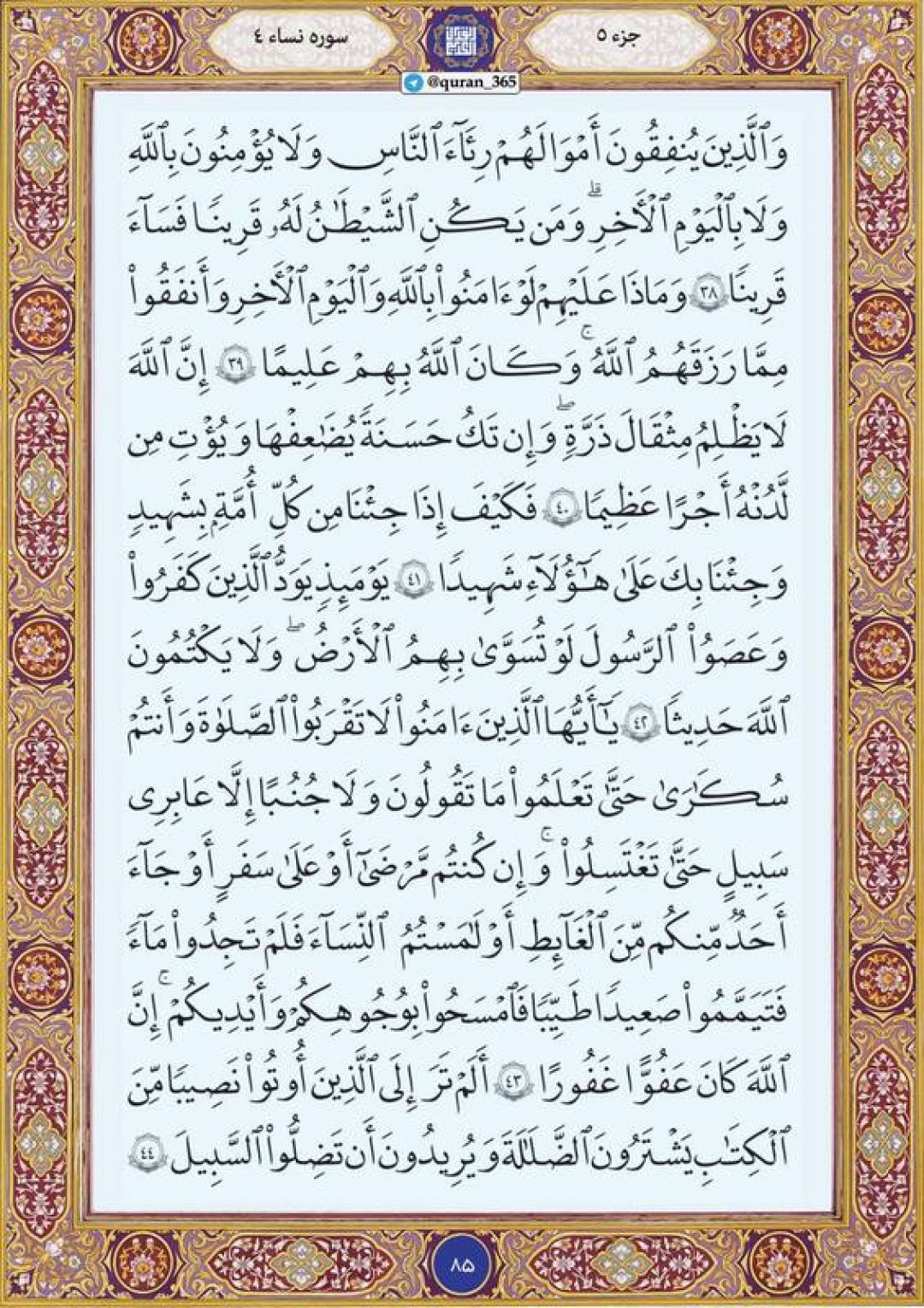 در ادامه جزء پنجم قرآن کریم، صفحه ۸۵ شامل آیات ۳۸ تا ۴۴ سوره مبارکه نساء تقدیم میشود.