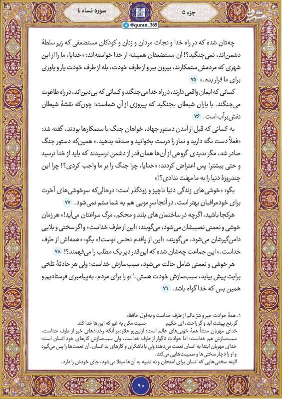 در ادامه جزء پنجم قرآن کریم، صفحه ۹۰ شامل آیات ۷۵ تا ۷۹ سوره مبارکه نساء تقدیم میشود.
