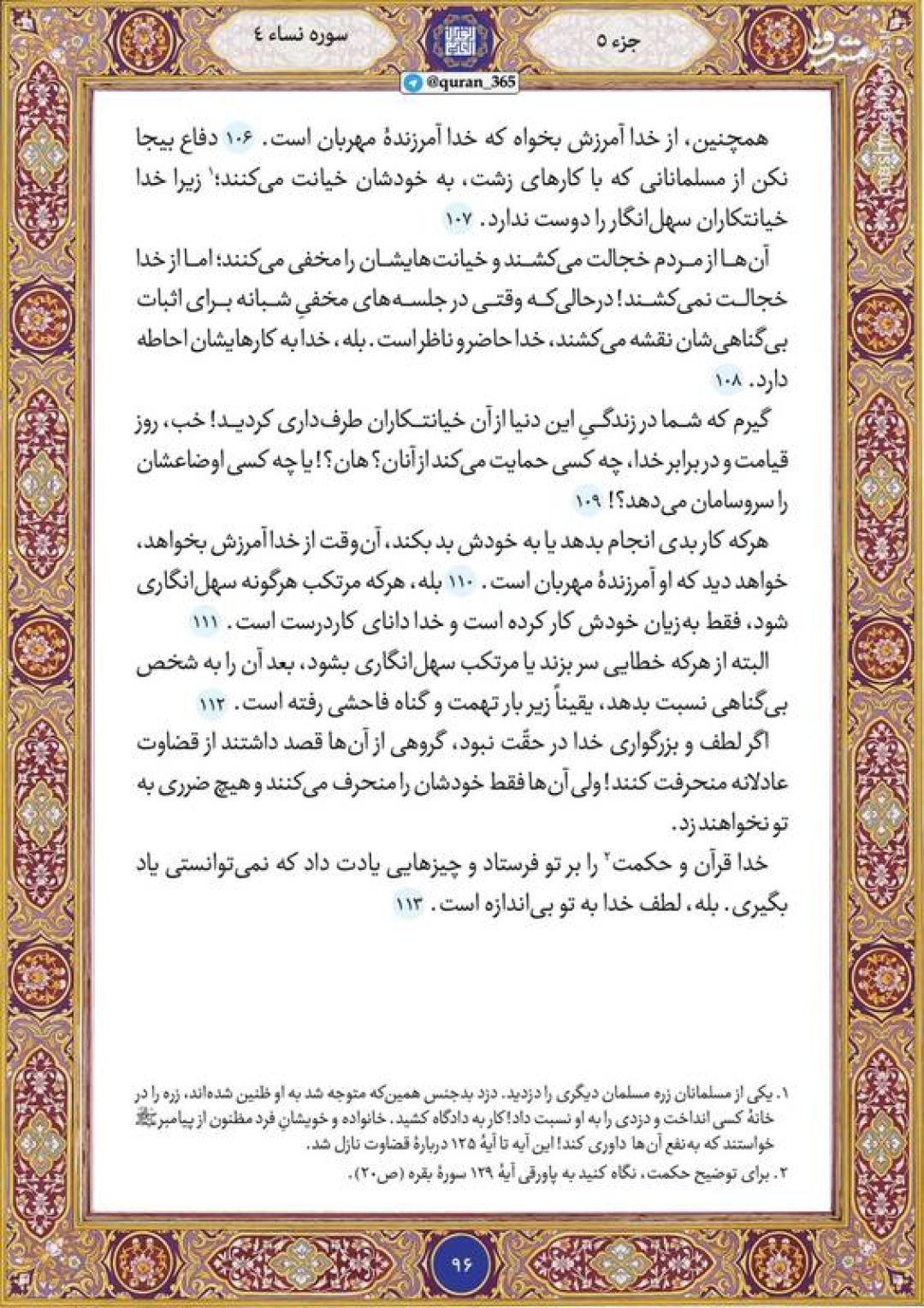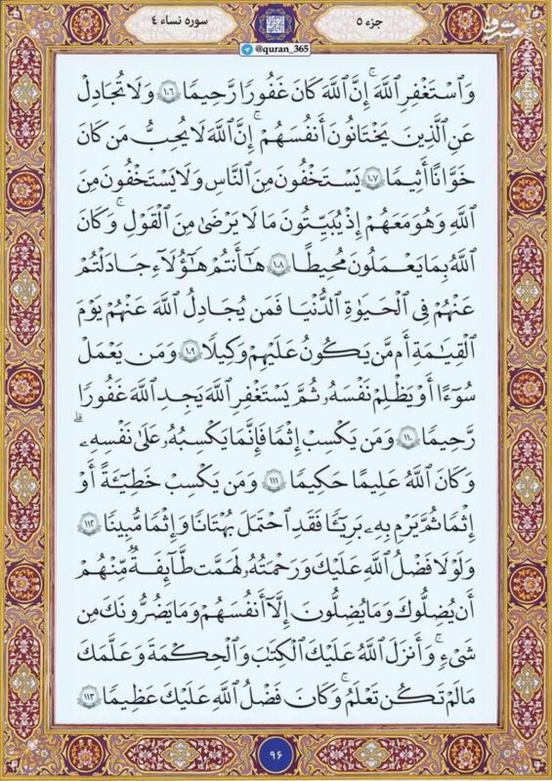 در ادامه جزء پنجم قرآن کریم، صفحه ۹۶ شامل آیات ۱۰۶ تا ۱۱۳ سوره مبارکه نساء تقدیم میشود.