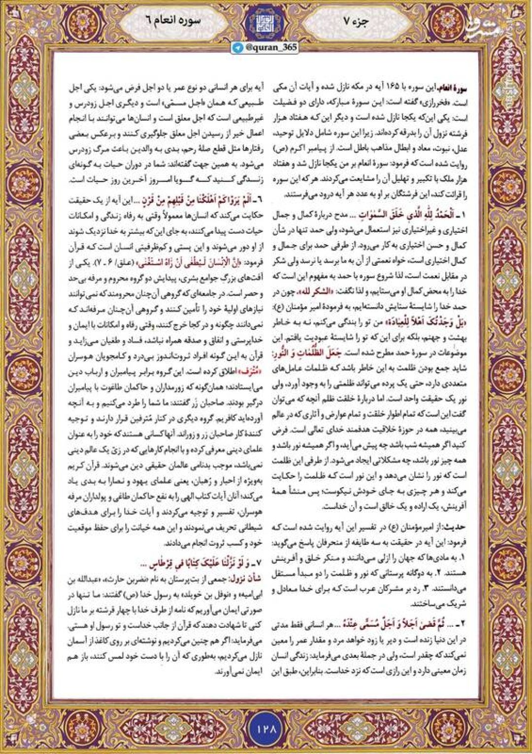 در ادامه جزء هفتم قرآن کریم، صفحه 128 شامل آیات 1 تا 8 سوره مبارکه انعام تقدیم میشود.