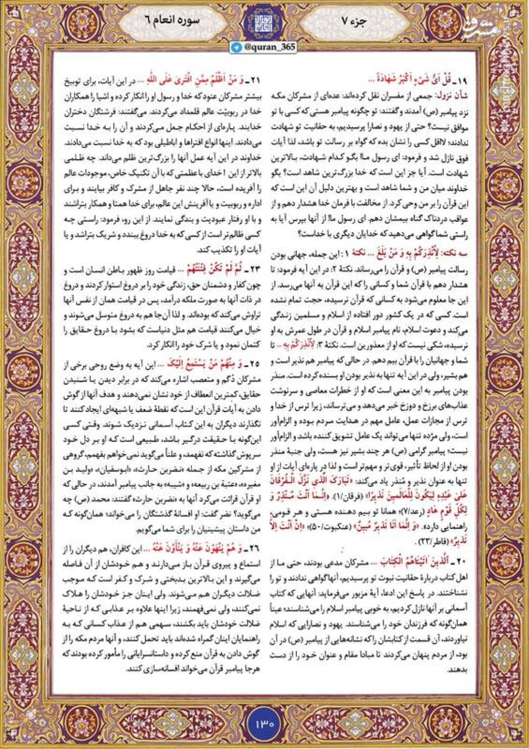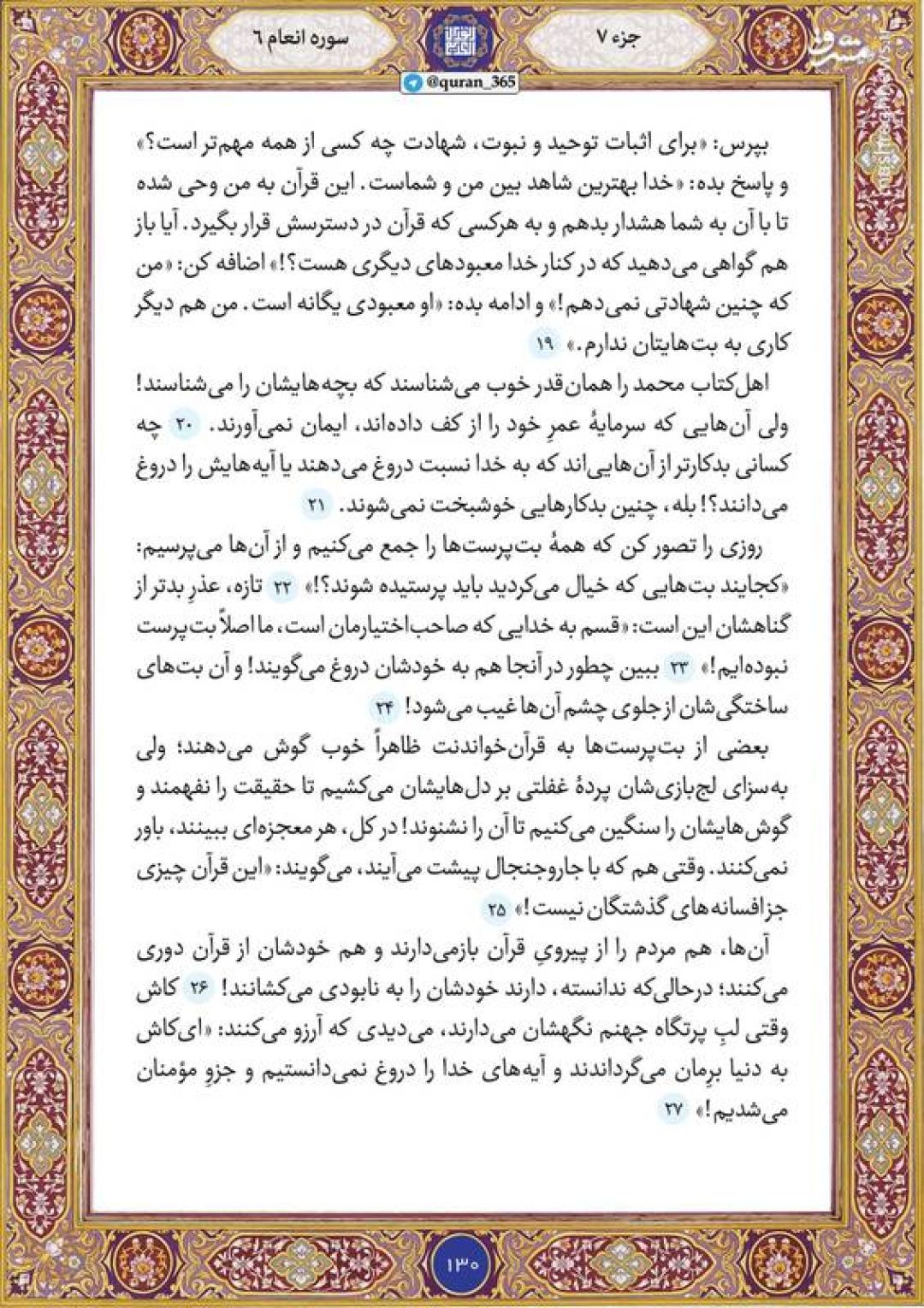 در ادامه جزء هفتم قرآن کریم، صفحه 130 شامل آیات 19 تا ۱۸ سوره مبارکه انعام تقدیم میشود.