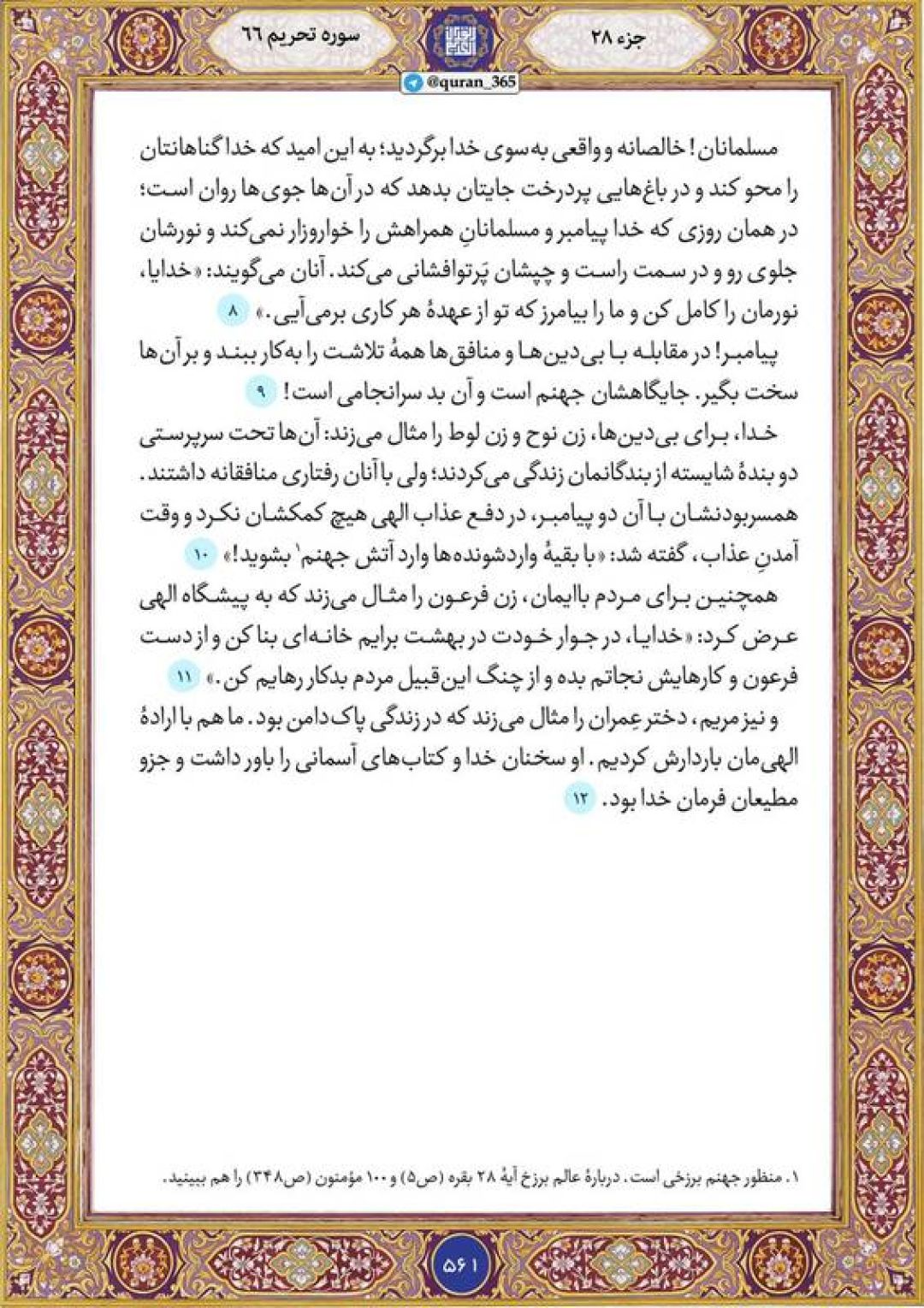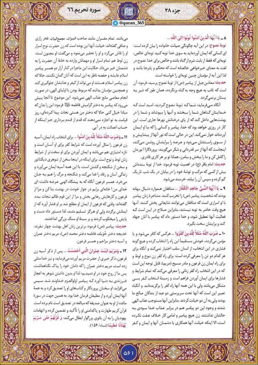 در ادامه جزء بیست و هشتم قرآن کریم، صفحه 561 شامل آیات 8 تا 12 سوره مبارکه تحریم تقدیم میشود.