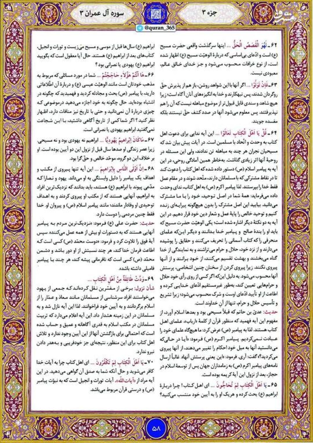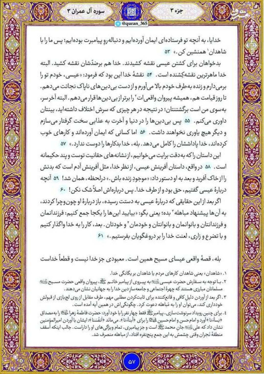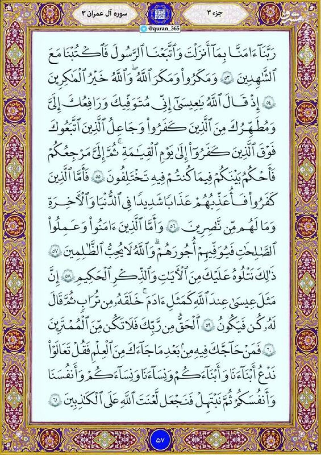 در ادامه جزء سوم قرآن کریم، صفحه ۵7 شامل آیات 53 تا 61 سوره مبارکه آل عمران تقدیم میشود.